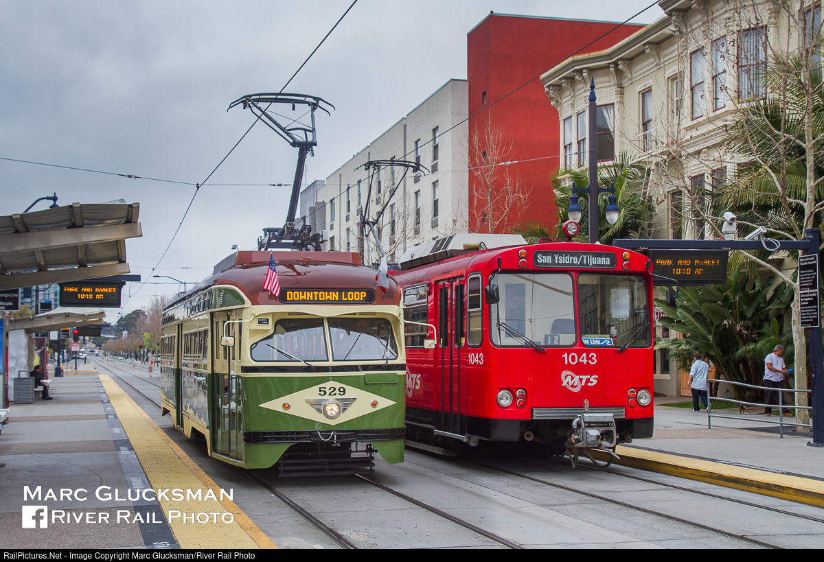 Heritage Style Meet At Park & Market. San Diego MTS PCC 529 (ex-San Francisco Municipal Railway 1122, née-St. Louis Public Service 1716, St. Louis Car Company, 1946) was the first heritage car restored for the Silver Line in San Diego, California, rebuilt in house by the SDMTS Shop and given this number as the last original San Diego PCC was 528. On March 29, 2012, it had a passing meet with SDMTS U2 Car 1043 at the Park & Market Station. While this car 1043 was subsequently retired and scrapped, the "original" San Diego 1043 was actually former a Metropolitan Street Railway car that was brought to the west coast during World War II for enhanced wartime service after retirement from service in New York City, and is today part of the Western Railway Museum collection. The Silver Line started as a heritage line on the Downtown Loop in 2011. SDMTS has since added former Twin Cities 529/NJ Public Service 10 PCC as car 530 and SDMTS U2 1001, the first new Trolley for the reborn line in 1981. Since the pandemic, the Silver Line only operates on holidays, so check their website before traveling.