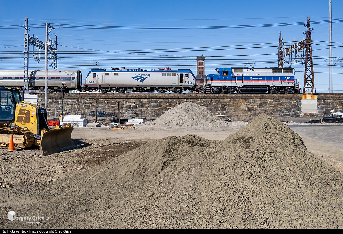 On the afternoon of March 10th, 2025, the Metro-North Railroad "NHS-1", with EMD GP35r 101, tows disabled Amtrak Regional train 172 through east Bridgeport, Connecticut on the New Haven Line. The final remaining building of the former Remington Arms, factory complex, the iconic shot tower, stands between the two locomotives.