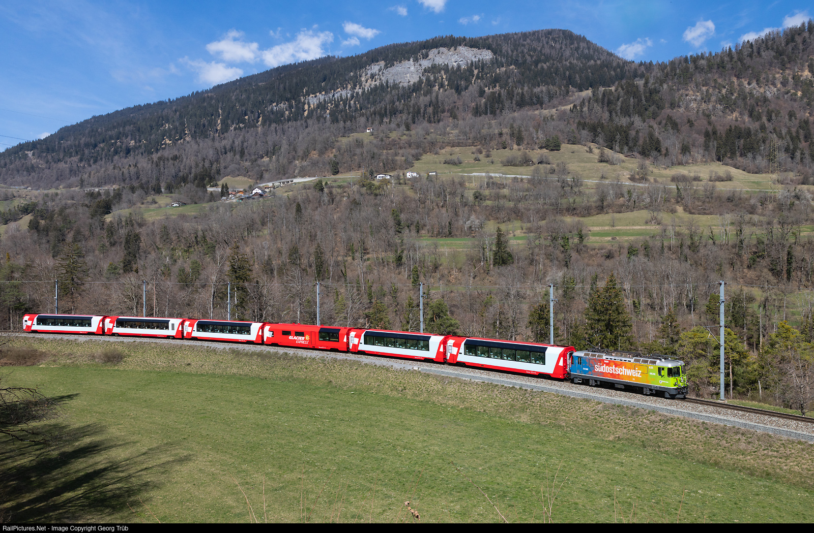 | Ge 4/4 II # 631 in the "Südostschweiz" (newspaper) publicity paint scheme pulls the PE 925 GLACIER EXPRESS St.Moritz-Zermatt on the leg til Chur, between Bonaduz and Reichenau-Tamins. |
