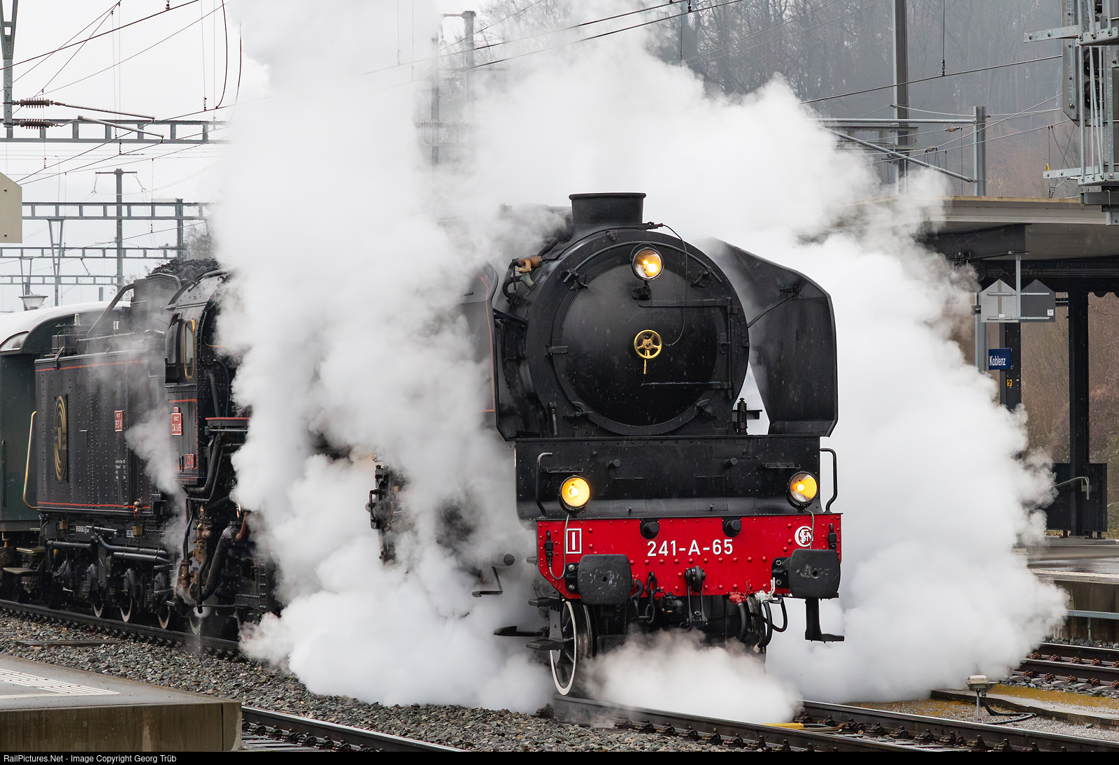 | The large former french railway SNCF 4-8-2 fourcylinder compound express train steamlocomotive 241 A # 65 of the association Dampflok-Depot Full (DDF) made a trip from Full AG to Biel and back this day, for some maintenance. The locomotive is departing in Koblenz with train 32872 to Turgi, with 5 former SBB mixed first/second class passenger cars and the RBe 540 # 074 of the Depot und Schienenfahrzeuge Koblenz (DSF) in the rear. |
