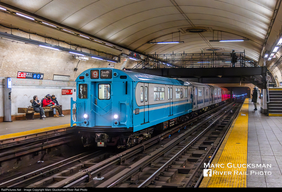 Going to The Home Opener. On March 27, 2025, MTA NYCT Subway/New York Transit Museum operated both a vintage set of IRT Lo-Vs and 1960's era cars for Opening Day. Continuing a long standing tradition, the train brings passengers from 42 Street-Grand Central to 161 Street-Yankee Stadium for no additional fare. One train, the green Lo-Vs, is from 1917, older than original Yankee Stadium itself. The other train, a version of the “Train Of Many Colors”, is from the early 1960s, and is composed of R-33/R-36 car types in various paint schemes. This annual tradition always draws a significant crowd in addition to the baseball fans attending the game. After leaving 207 Street Yard, R-33S 9308 leads the deadhead consist in its 1964 World's Fair paint on the way to the Nostalgia Ride, seen passing through the cavernous 168 Street Station in upper Manhattan. Though not stopping, the car is displaying an appropriate vintage "9/South Ferry" destination, a throwback to 1989 to 2005 when the 1 and 9 operated 'skip stop' service during rush hour.