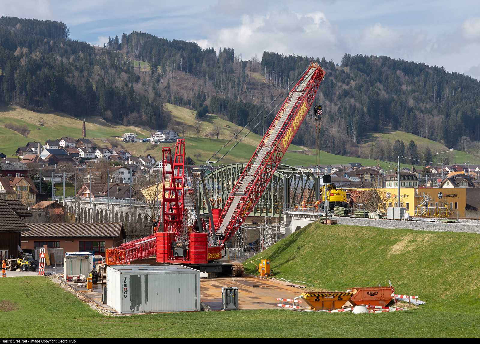 The 296-metre-long Sitter Viaduct in Appenzell was built between 1902 and 1904 for the meter-gauge Appenzeller Strassenbahn (ASt), mainly with tamped concrete arches, but also a 49-metre-long truss bridge over the river. The viaduct, which today belongs to the Appenzeller Bahnen (AB) on the Appenzell-Gais line, has been extensively renovated over the last year. This weekend, the renovated, 90 ton truss bridge was lifted back into place; it had been replaced by a temporary bridge. Two large cranes from the Emil Egger company were used for this purpose and are now being dismantled.