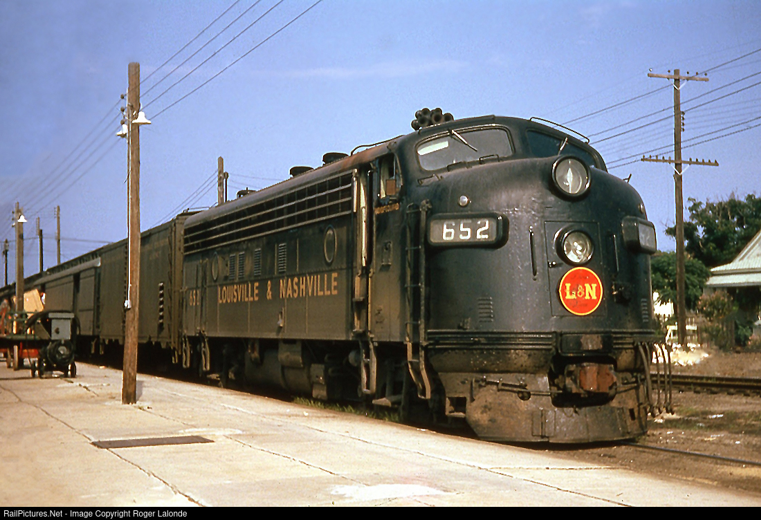 Louisville & Nashville FP7 652 leads passenger train The Gulf Wind at Pensacola, FL on August 03, 1963. The Gulf Wind was a joint operation by the Louisville & Nashville and the Seaboard Railroad. The train's 617 mile route ran from New Orleans, Biloxi, Mobile, Pensacola, Chattahoochee, Tallahassee to Jacksonville, FL. Locomotives were changed at Chattahoochee where the L&N rails met those of the SAL. D.W. Salter photo, from my collection.