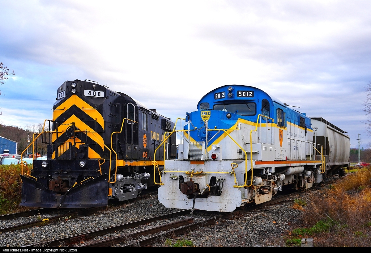 While headed to Conway Scenic Railroad for the annual 470 Railroad Club excursion, I decided to swing by the elusive Batten Kill Railroad to see if there were any signs of life. As expected, they weren't running this day, but I did manage to get a photo of Southern New England Railroad's RS-36, 5021, sitting next to new arrival, high-nose RS-36 408. The 408 recently arrived from the Ontario Midland, and is ex-Norfolk & Western. The 5021, despite the D&H-inspired paint, is also of N&W heritage, having originally operated on the Atlantic & Danville, later the Norfolk, Franklin & Danville.