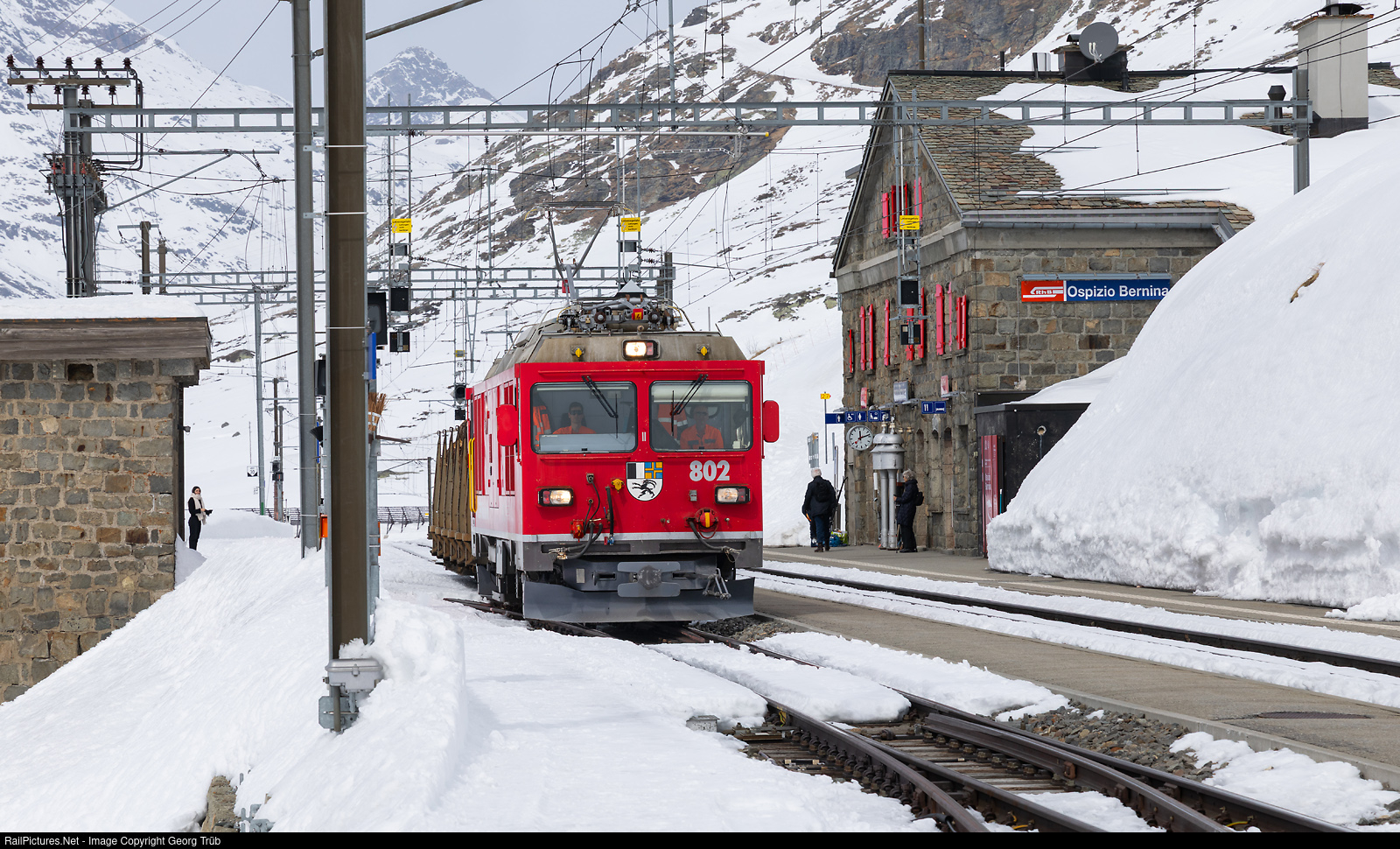 | What looks like a short freight train on the Bernina line is actually an instruction train for engine drivers. Rhaetian Railway dual-power locomotive Gem 4/4 # 802 pulls a wagon loaded with tree trunks as train 9627 from Pontresina to Tirano and arrived Ospizio Bernina for a crossing. The two Gem 4/4 locomotives # 801 and # 802 of the Rhaetian Railway, built in 1966, are due to be withdrawn in some years, when new diesellocomotives ordered from StadlerRail will be in operation. |
