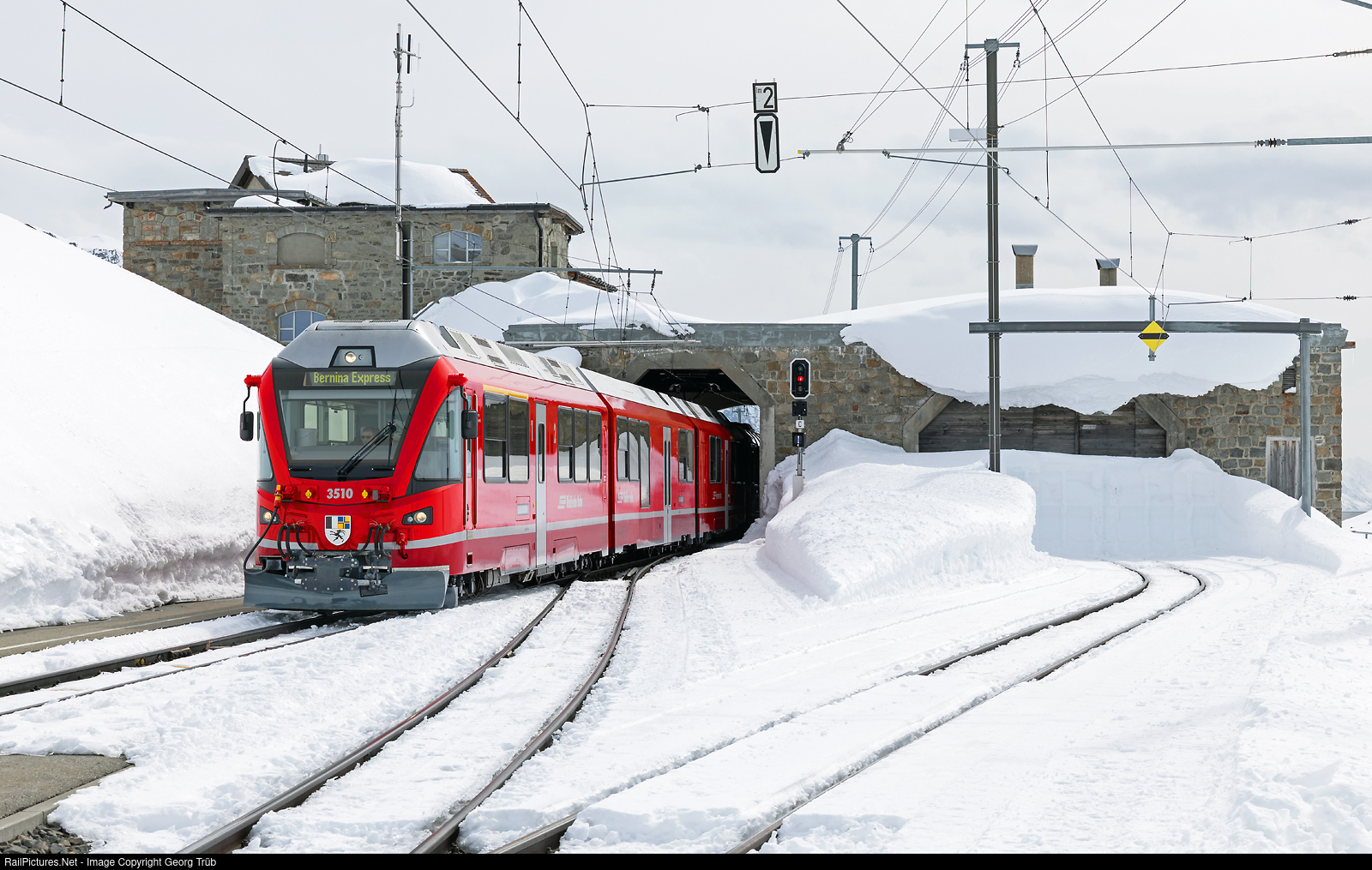 | "Allegra" railcar ABe 8/12 # 3510 of the Rhaetian Railway is entering Ospizio Bernina station, pulling the PE 972 BERNINA EXPRESS from Tirano to St.Moritz. |