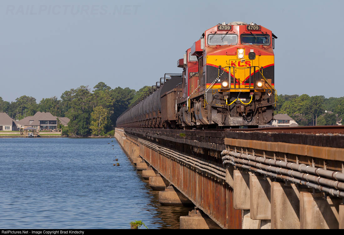 | Empty KCS gasoline train Q59300302 crosses Lake Houston on it's way from Queretaro, QE to Korf, TX. I wouldn't mind one of those million dollar homes overlooking the UP main. |
