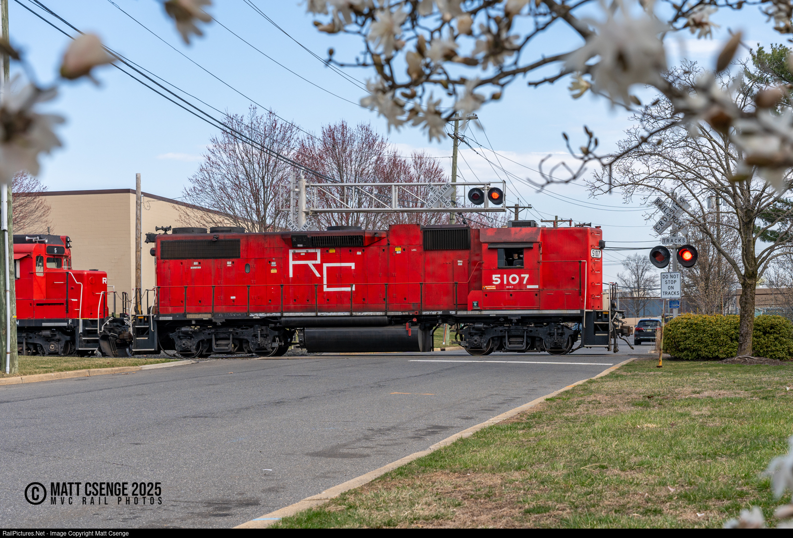 Raritan Central Railway GP38-2 no. 5107 is seen leading train RC1 across Parkway Pl in the Raritan Center business park. Spring is just beginning to show itself here in New Jersey, with buds and flowers beginning to emerge. |