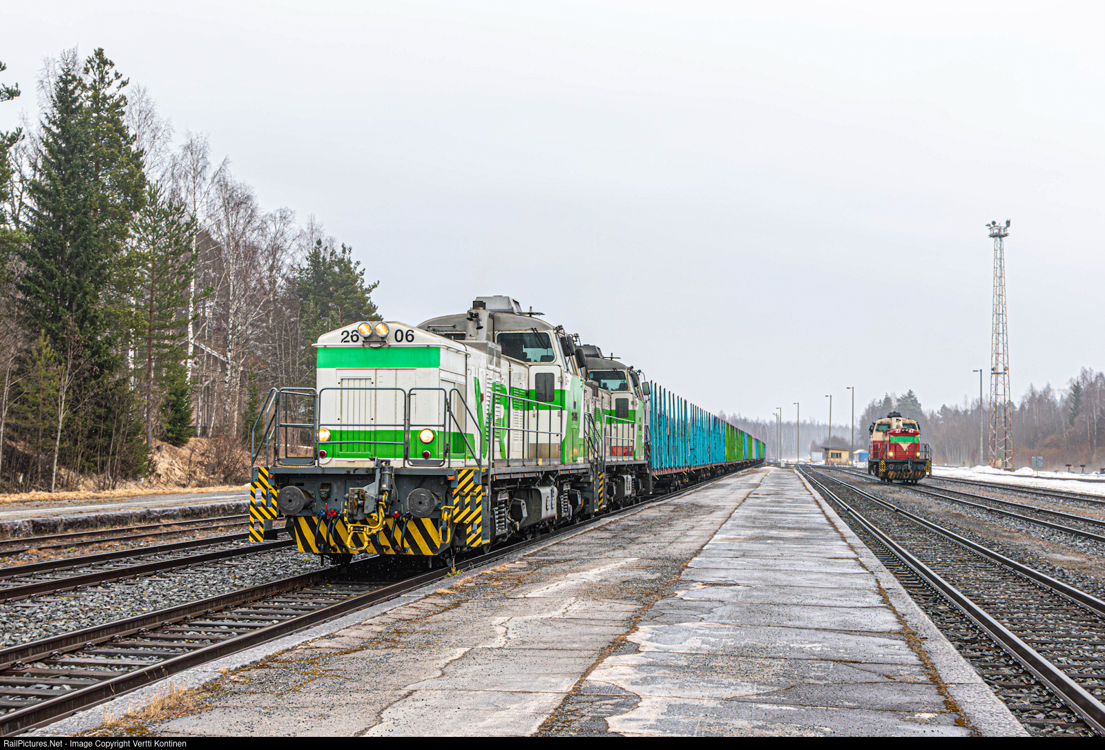 | VR freight train T 3381 from Jyväskylä to Alavus passes Haapamäki station with Dv12 2606 and 2605, both in the 2010s livery on point. In the background, Dv12 2747 in the original livery is waiting for departure back to Tampere after bringing an empty train for loading earlier that day. |