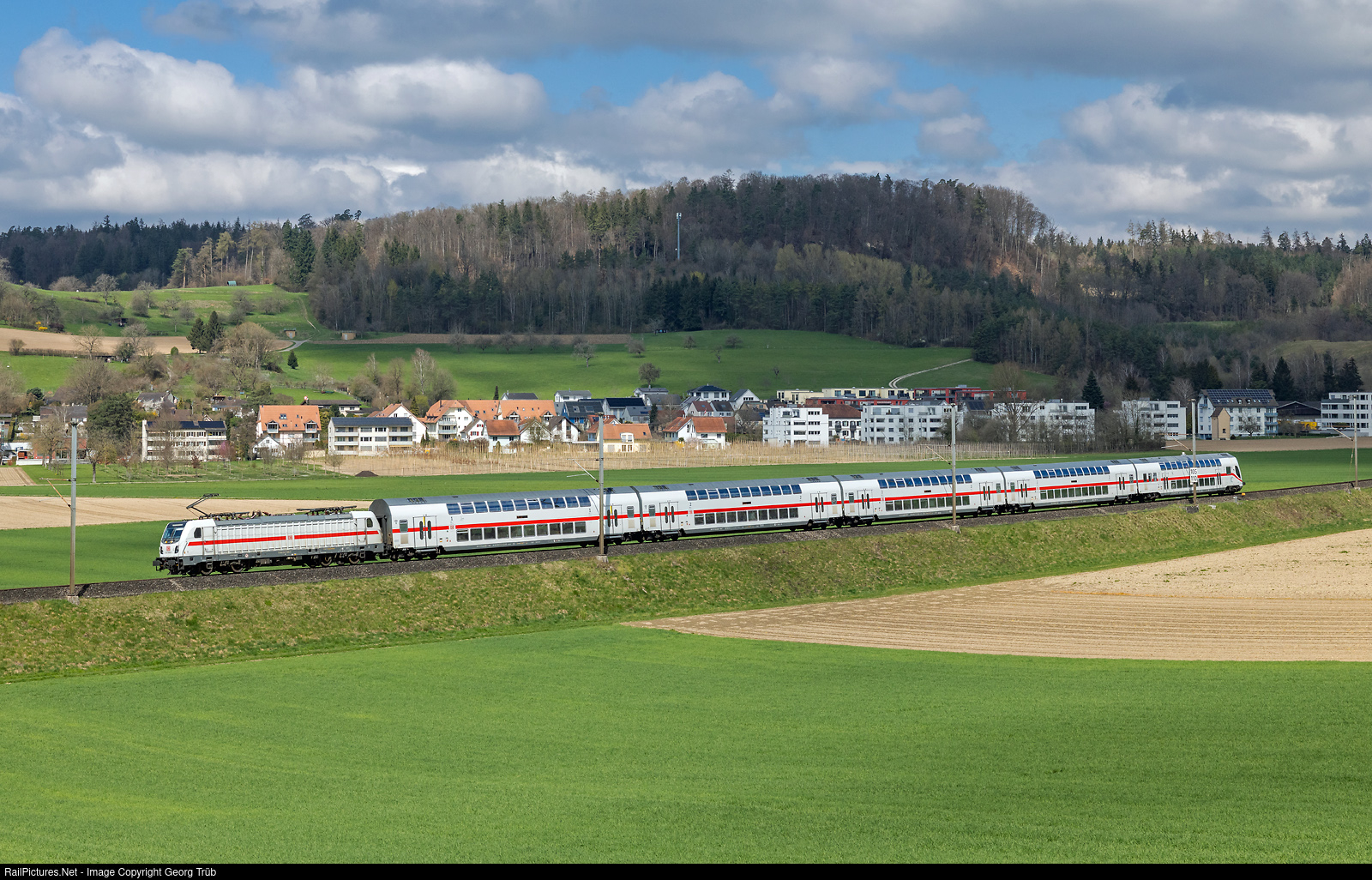 Bombardier TRAXX P160 AC3 147 # 568 of the Deutsche Bahn is running the IC 188 from Zürich via Schaffhausen-Singen to Stuttgart, between Rafz and Lottstetten. This type of doubledeck push-pull trains, called IC2 by the DB AG, should run on this line since years. Severe software troubles delayed the change to the IC2 trains. The IC2 will replace the former Westbahn doubledeck "KISS" of the 4010 series from StadlerRail. They have slighter less seats (468 instead of 480), which is a problem in peak hours between Zürich and Schaffhausen. In addition, a major step backwards in terms of accessibility: instead of level access from the 55 cm platform at all doors, the IC2 has level access at the cab car only.