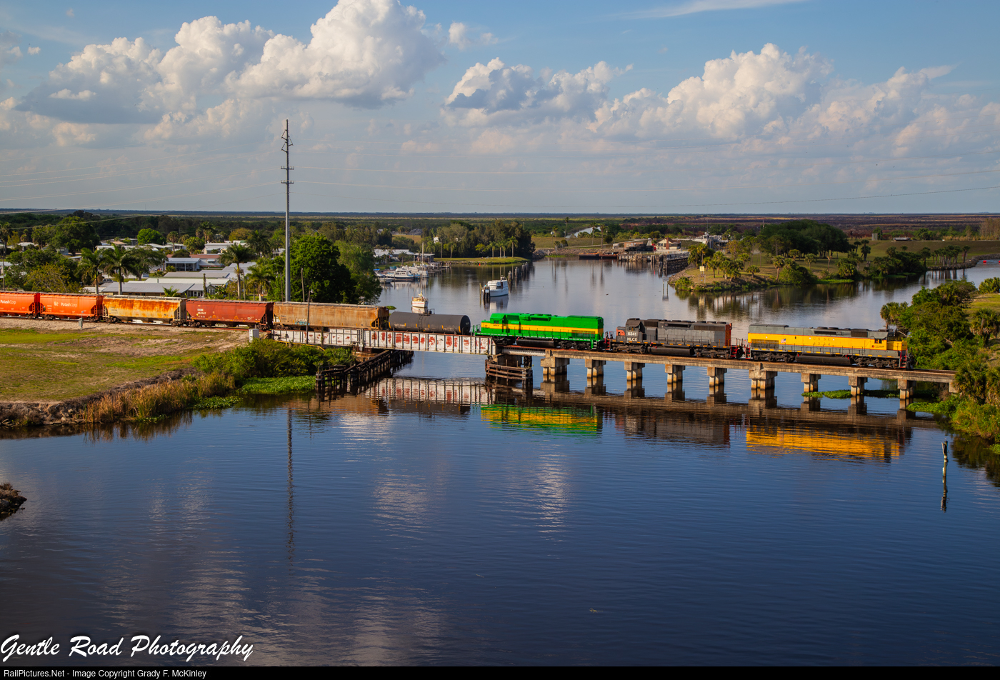 USSC #6324 (SP 6854), HLCX #6341 (SP 8436), and WRIX #50 (SP/DRGW 5412) lead the eastbound "Sebring Turn" across the Caloosahatchee at Moorehaven, FL in golden light on the last day of March 2025.