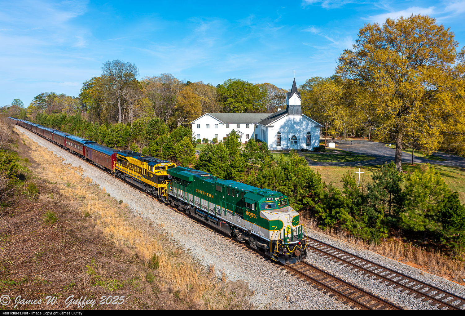 In a tradition unlike any other, the Masters OCS heads south on the former Southern mainline, much later than usual. I took the opportunity to capture it at Landis, where late day sun is needed to light the church.