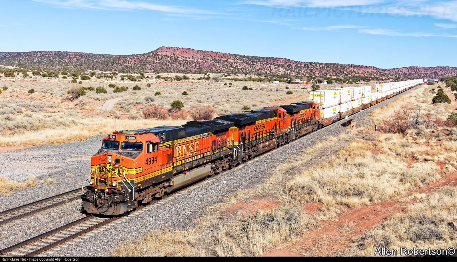 | BNSF 4994, 5535, & 6853 lead westbound stacks about to duck under Hwy 60 & start the descent into Abo canyon. |