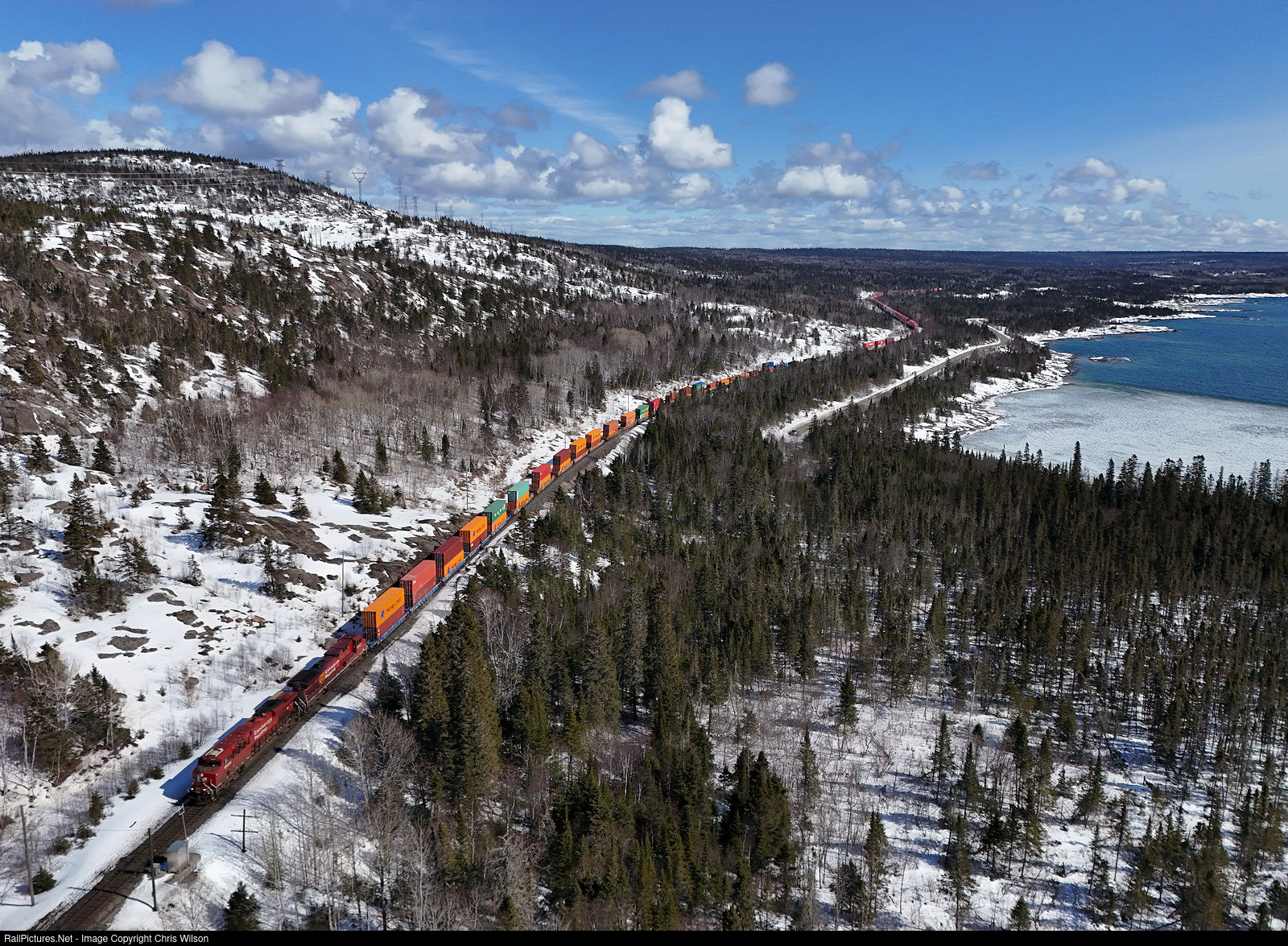| Montreal to Vancouver hotshot 113 heads out of Marathon along Lake Superior. It is no fooling with sub zero temperatures overnight along the north shore creating surface ice in Peninsula Bay being quickly pushed into coves with a steady south wind whipping up before a front moves into the region dumping more snow! |