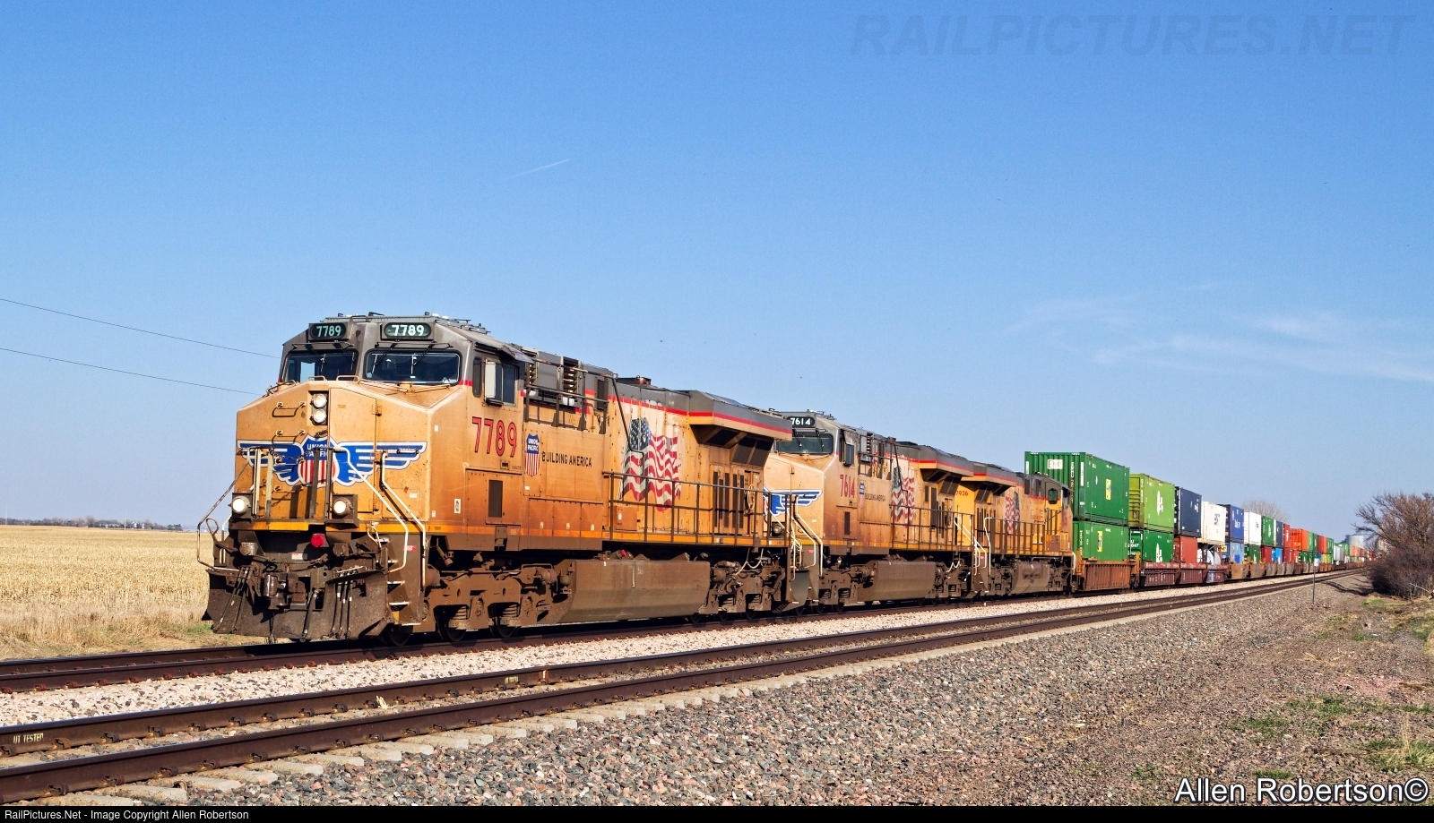 | Three GEs, UP 7789, 7614, & 7936, lead a westbound stack train on the Marysville subdivision. |