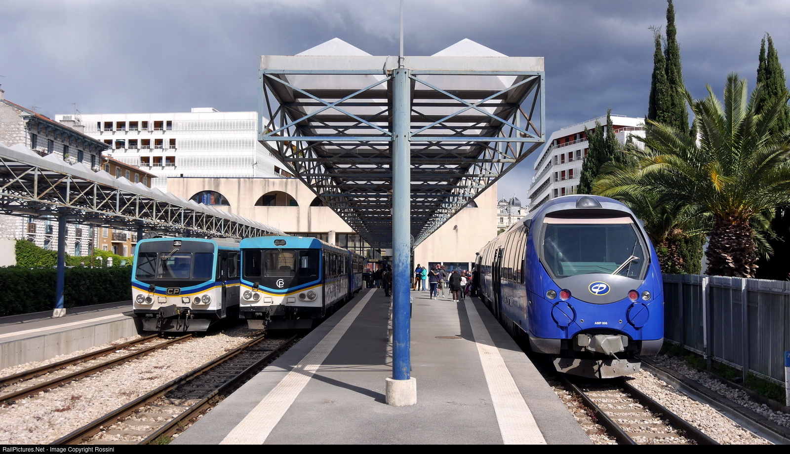 'Chemin de fer de Provence' terminal station in Nice with four generations of railcars: AMP806 diesel multiple unit from 2010, railcar X304 (1971) in the middle, behind it railcar X307 (1975) and railcar X306 (1977) on the far left and behind it railcar X303 (1971)