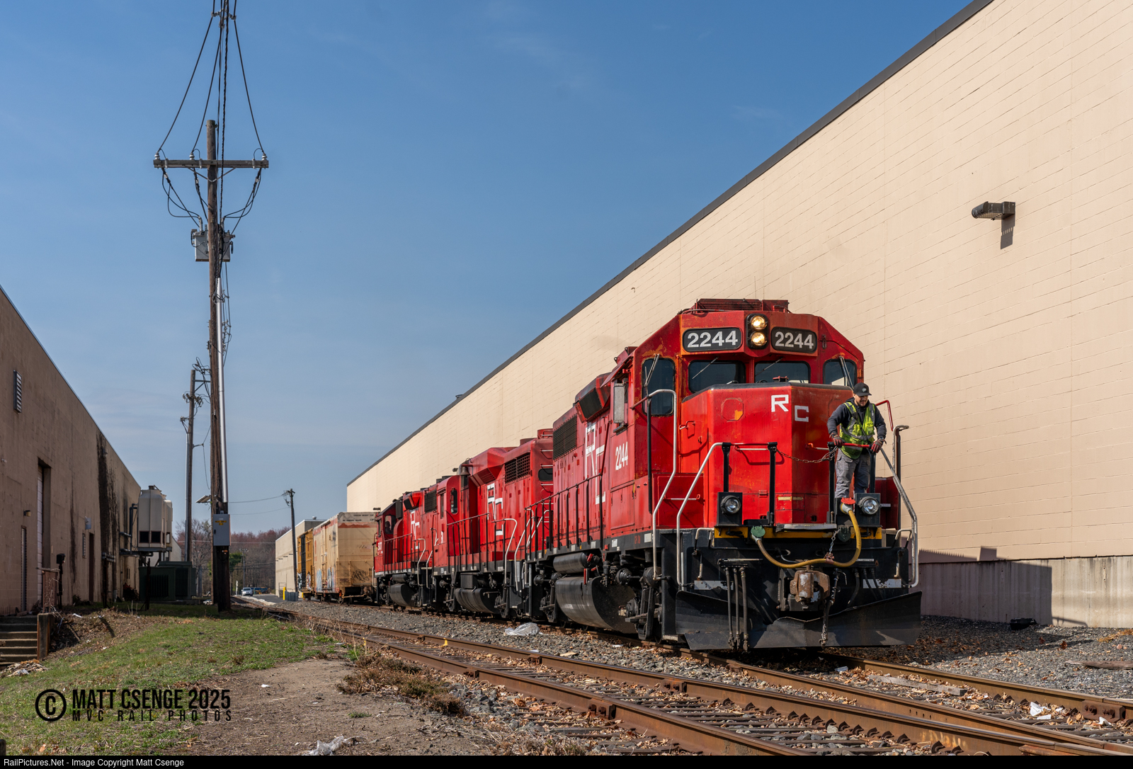 Raritan Central Railway GP38-2 no. 2244 is seen leading GP30 no. 5 and GP38-2 no. 5107 off a siding after delivering a couple cars to an industry in the Raritan Center business park. The conductor is riding the front of the the consist as the engineer is operating from the rear locomotive. |