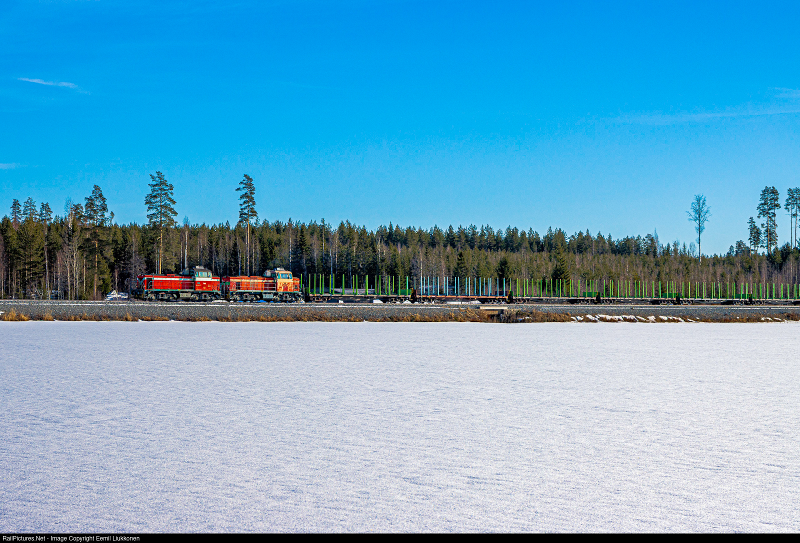 | A nice early spring morning has started at Haapamäki and the sunshine reveals the still frozen lake Tyrisevä rail bank of which has already being cleared from snow. Studently, two class Dv12s appear on the scene as they have started their shift from Jyväskylä a hour ago. The pair is delivering empty timber wagons to Alavus where they will also fetch loaded ones before they will carry on to their return trip back to Jyväskylä. |
