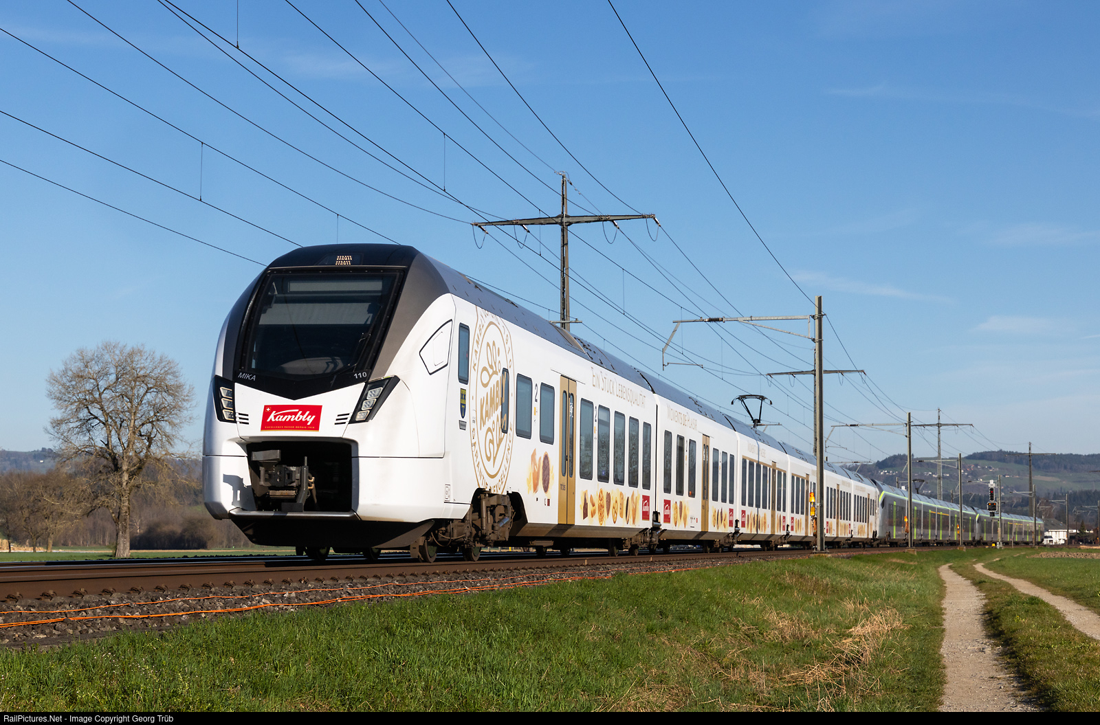 Three Flirt MIKA RABe 528 # 110, # 125 and # 128 of the BLS in multiple control are running the RE 4163 of the line RE1 from Bern via Thun to Spiez, between Uttigen and Thun. In front is the train in the "Kambly" (bisquits from Trubschaden) publicity paint scheme. First two trains will run from Spiez to Brig and Iselle di Trasquera, last train to Zweisimmen.