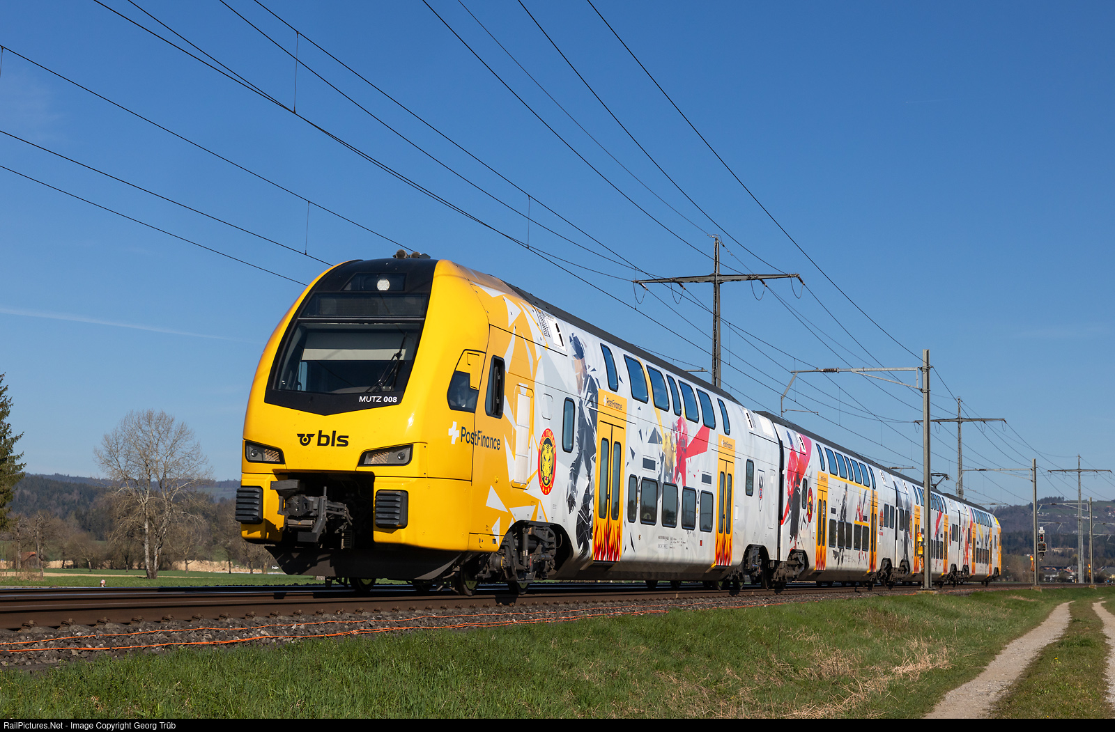| Doubledeck commuter train MUTZ RABe 515 # 008 of the BLS, in the special Ice Hockey paint scheme, is running the S1 service 15131 from Fribourg via Bern to Thun, between Uttigen and Thun. |