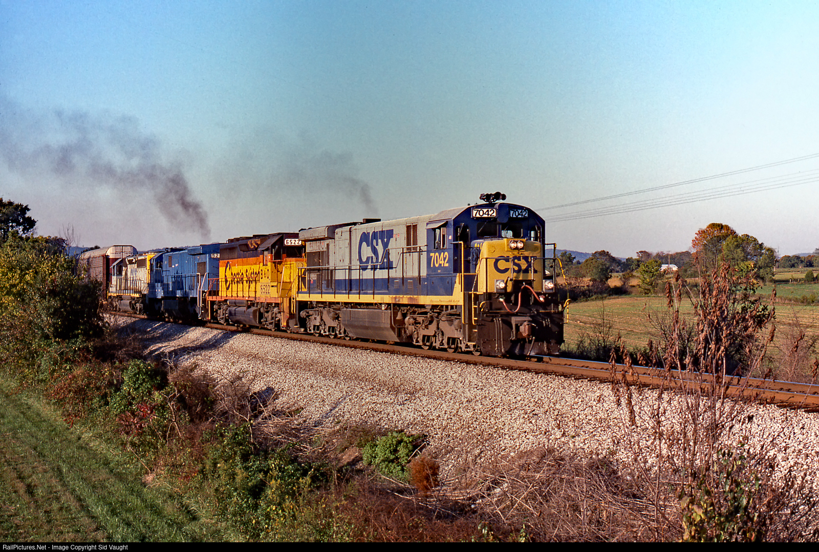| Southbound racks behind with GE with pedigree SCL>SBD>CSX and sounding good thanks to the lack of exhaust silencer mandated later in the production run of this model. Photo by Jim Satterwhite. From my collection. |