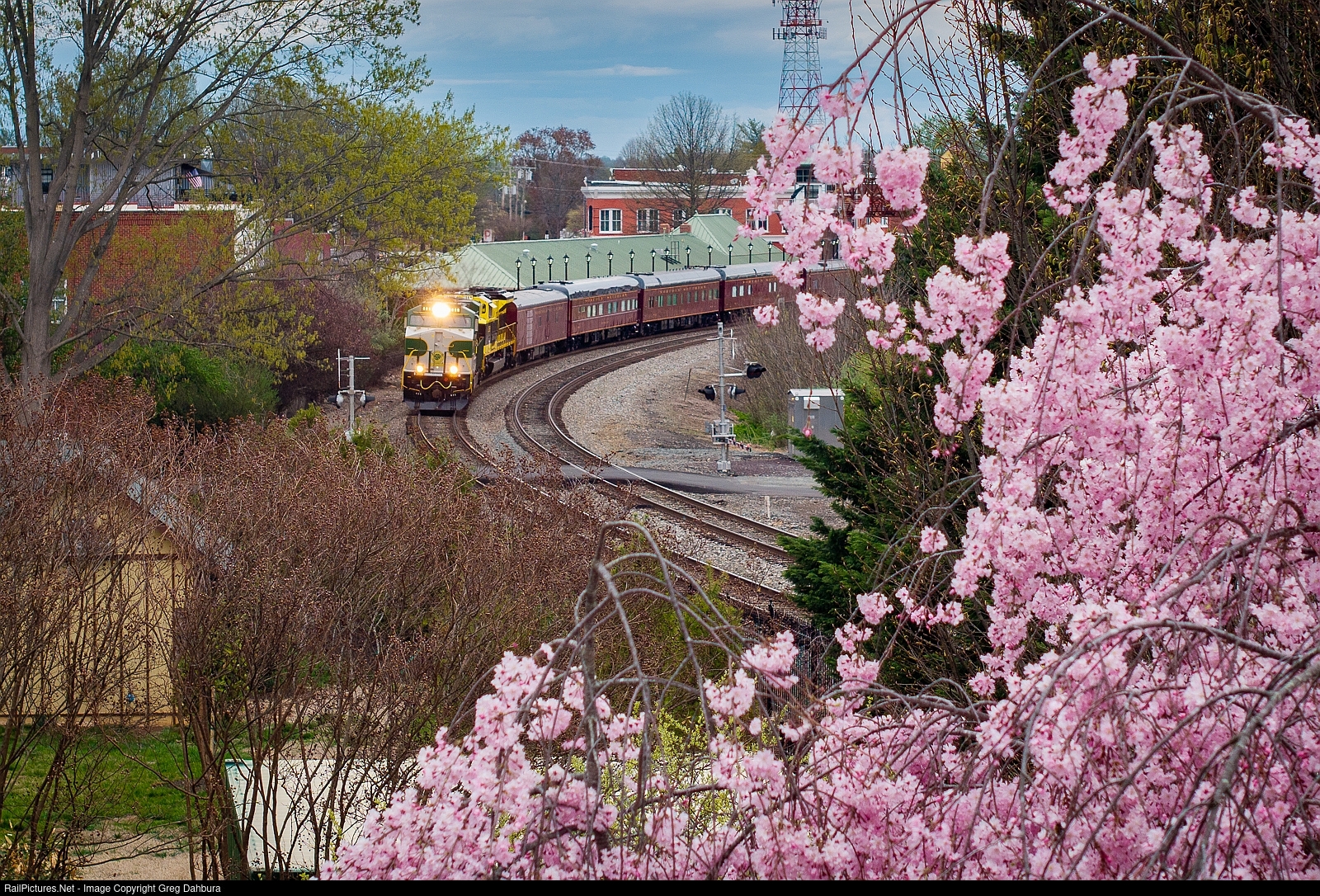 The NS OCS heads around a sharp curve at the station in Culpeper, past some nice spring scenery, on its way to Augusta, Ga. for the Masters Tournament.