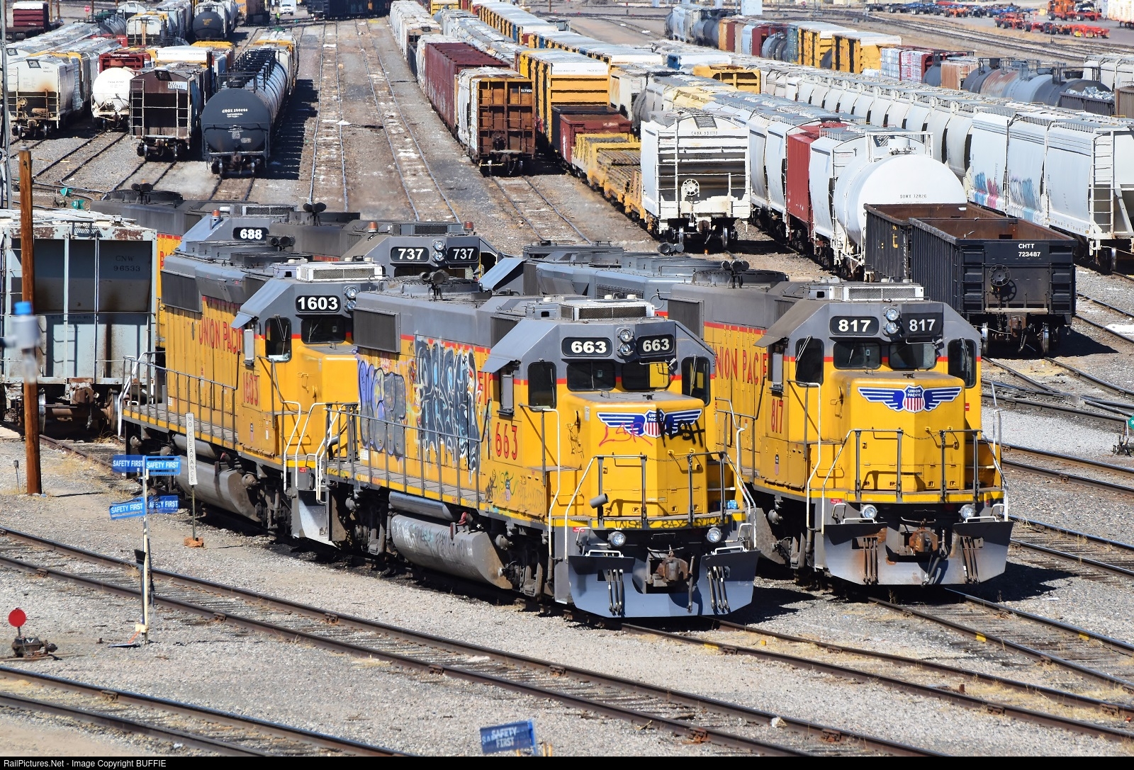 | UP 663 (GP38-2) must have spent some time in California before arriving in the North Yard in Denver, Colorado.