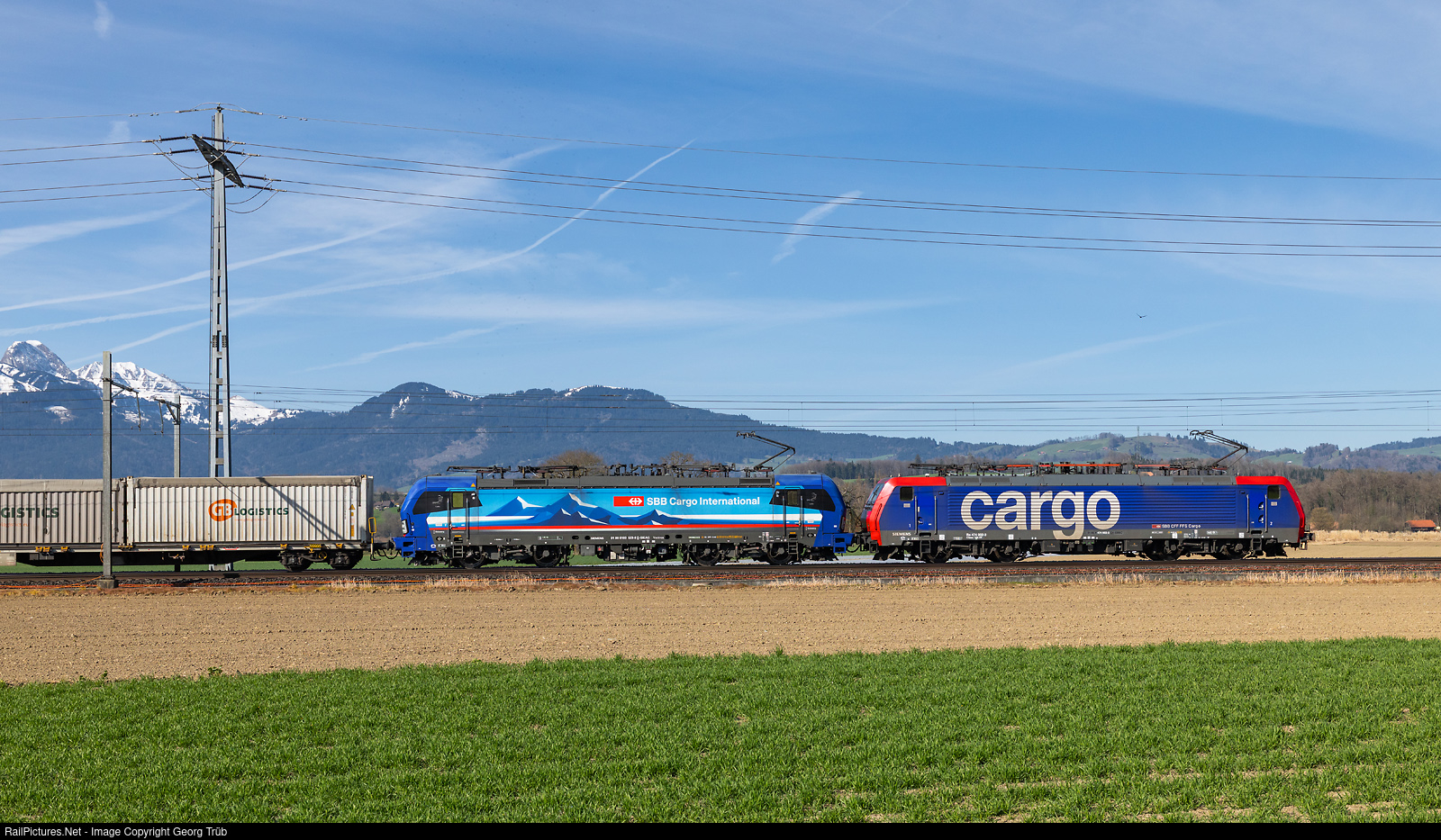 Siemens ES64 F4 Re 474 # 002 of the SBB and Siemens "Vectron" 193 # 523 of SBB Cargo International, rented from the SüdLeasing, in multiple control, pull the northbound intermodal train 43700 from Novara Boschetto/Italy via Domodossola-Simplon-Lötschberg-Basel to Hannover Lindenhafen/Germany, between Thun and Uttigen.
