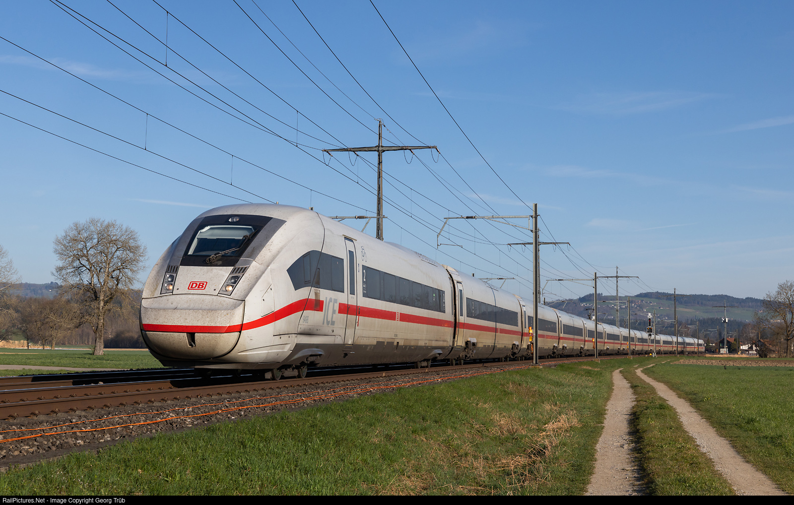 | The rather dirty ICE 4 # 9498 of the Deutsche Bahn is running the IC 333 of the line IC61 from Basel via Olten-Brn-Thun to Interlaken Ost, between Uttigen and Thun. |