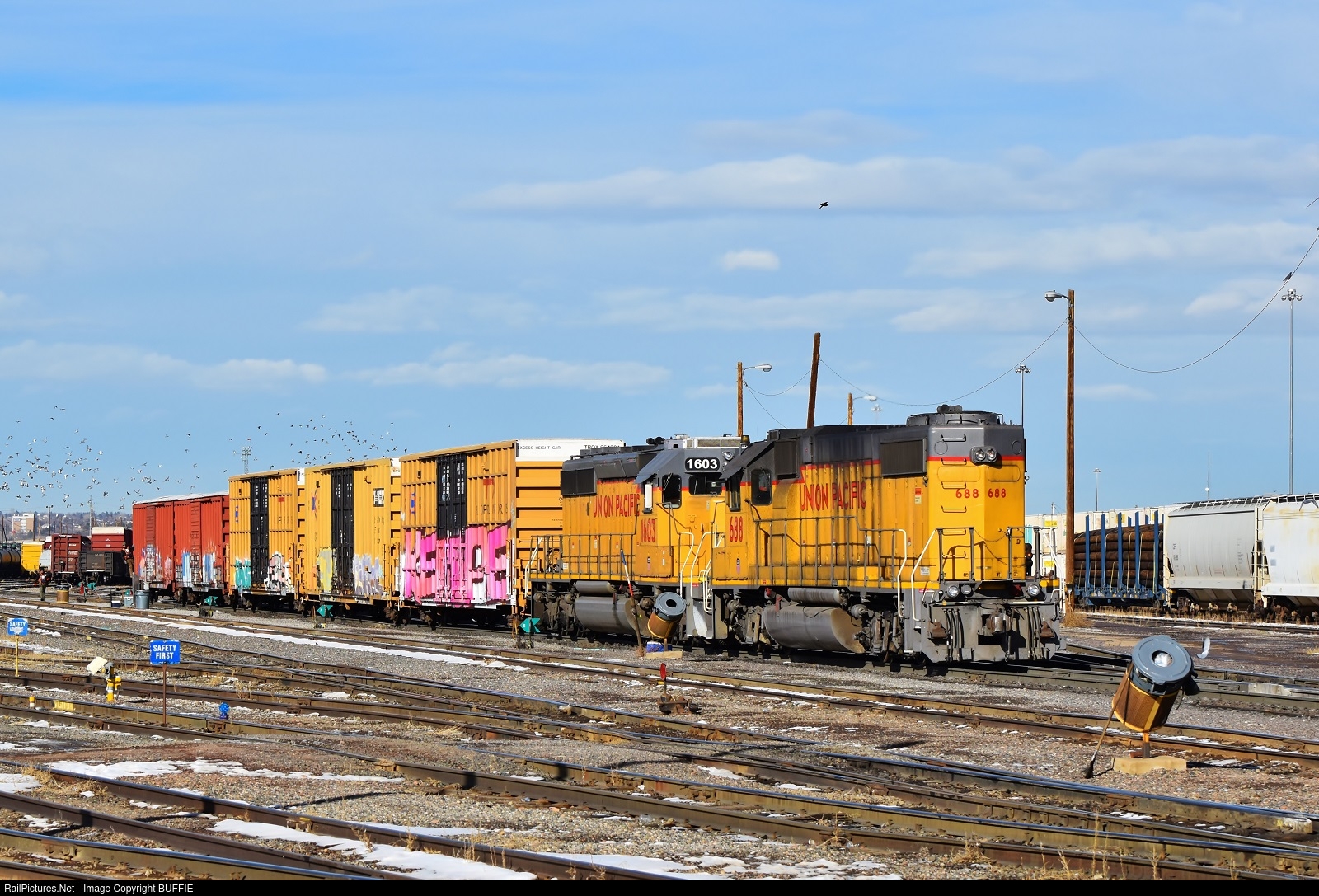 | UP 688 (GP38-2) runs long hood forward in a Siamese configuration as it works shuffling cars in the North Yard in Denver, Colorado.