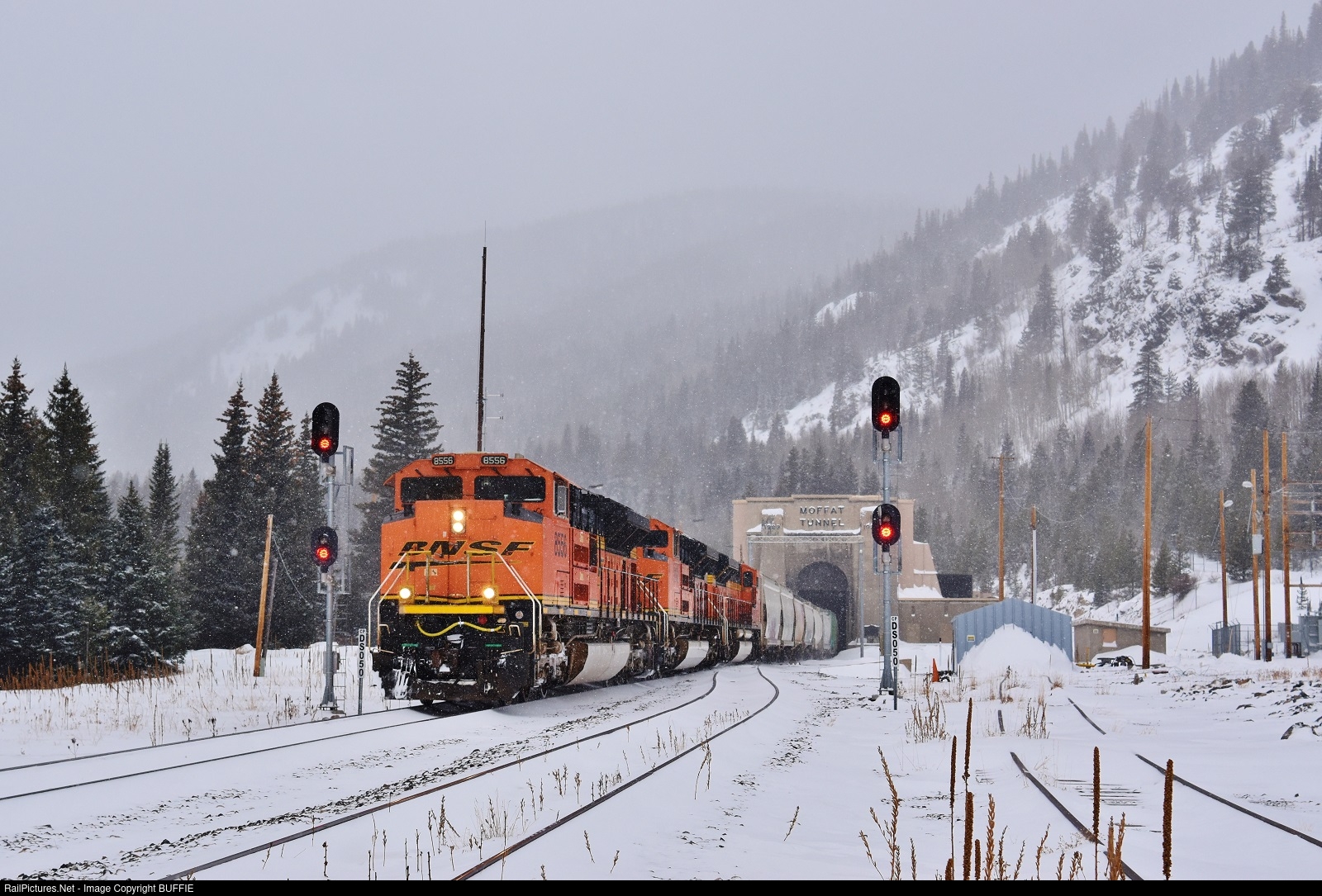 BNSF 8556 (SD70ACe) exits the east portal of the Moffat Tunnel into a snowstorm that is dropping 10 inches in the valley.