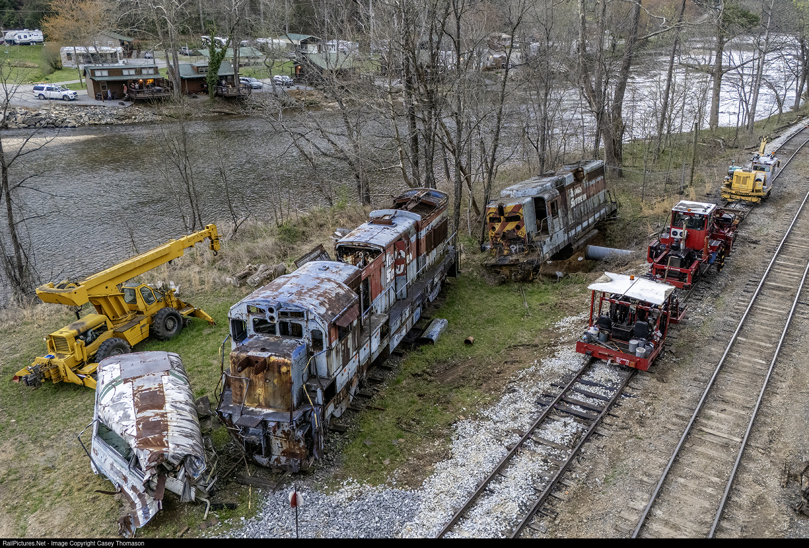 Along the banks of the Tuckasegee River, just west of Dillsboro, North Carolina, is the "crash site" where an Illinois Southern train collided with an Illinois Department of Corrections prisoner transport bus, one of the more elaborate sequences of the Warner Brothers 1993 Harrison Ford movie The Fugitive. The train featured ex CSX (SCL) U18B 1901 and ex NS GP30 (NW) 536, both gutted of its major components and being pushed by Great Smoky Mountains Railroad power. After the one-shot crash filming was completed, the locomotives were left at the site for tourism purposes, and can be seen from aboard the Great Smoky Mountains Railroad trains that operate between Bryson City and Dillsboro (the Tuckasegee River Excursion). You can view a neat "making-of" youtube video of the wreck at the following site: https://youtu.be/raalmAFeloA?si=hUGJ9sxHCc4ItEQZ