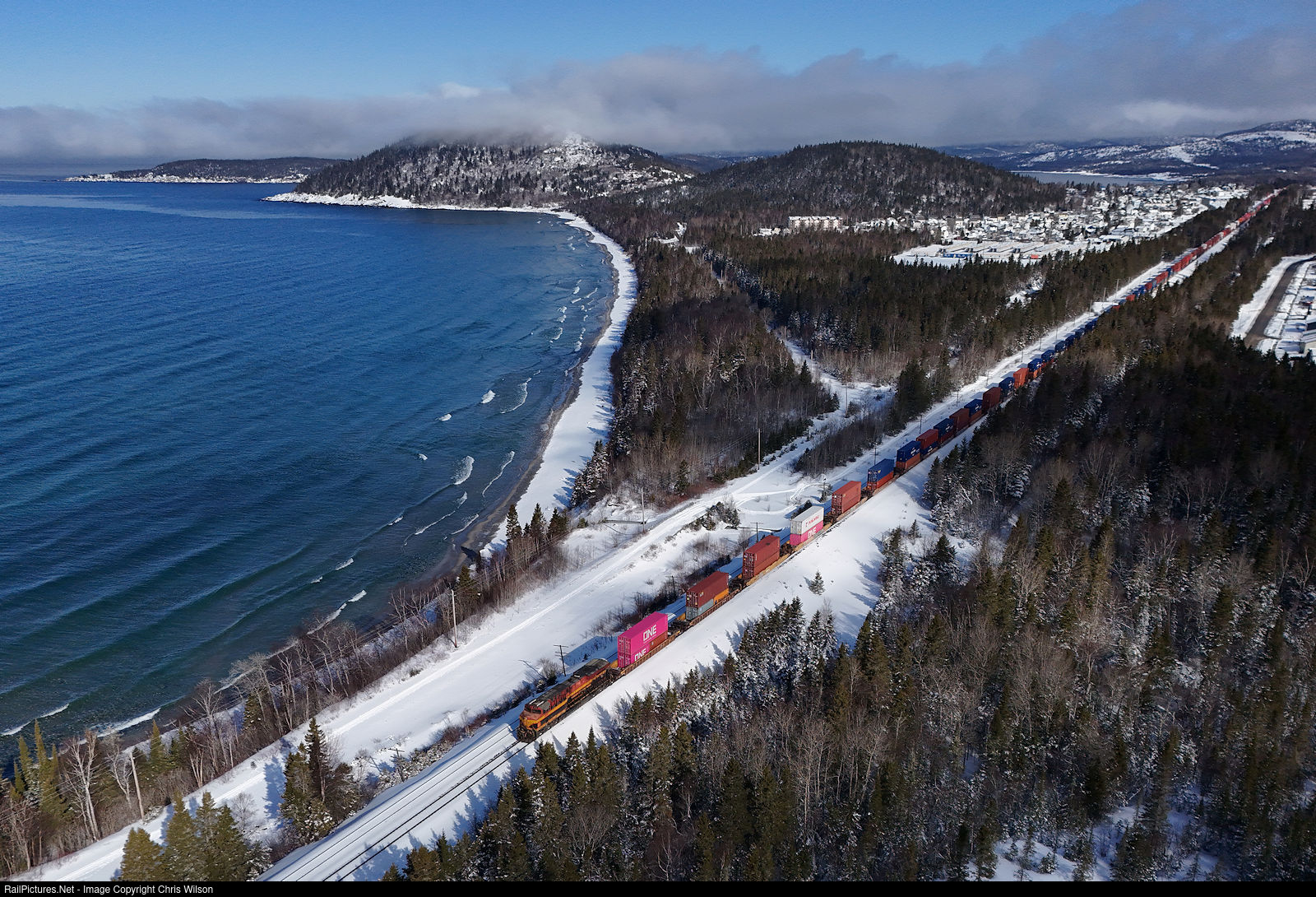 Westbound sea cans for the Port of Vancouver in British Columbia speed down the main at Marathon alongside Lake Superior & Pebble Beach with KCS ES44AC 4816 as the tail end remote.