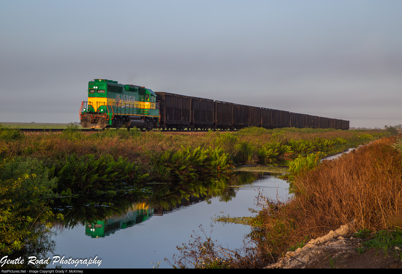 USSC #4201 leads an early morning Cane 2 on the Clewiston mainline along one of the classic canals that dot the landscape in the fields.