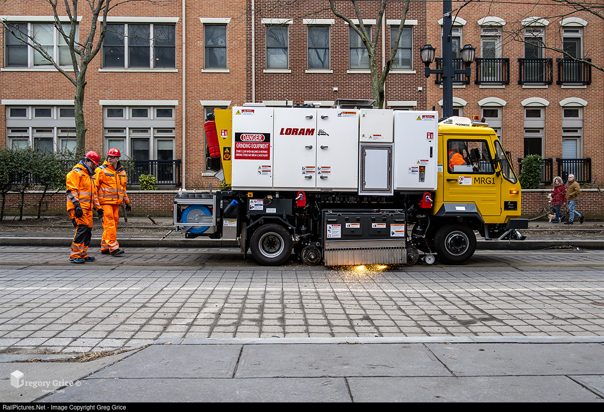 On March 16, 2025, Loram’s Möser Road/Rail Grinder RO-V 149 “MRG-1” works its way down Essex Street in Jersey City, New Jersey, performing rail grinding on the NJ Transit Hudson-Bergen Light Rail’s (HBLR) Riverline Branch. This portion of the line is the only segment shared with automobiles, requiring a temporary street closure to thru traffic during maintenance.