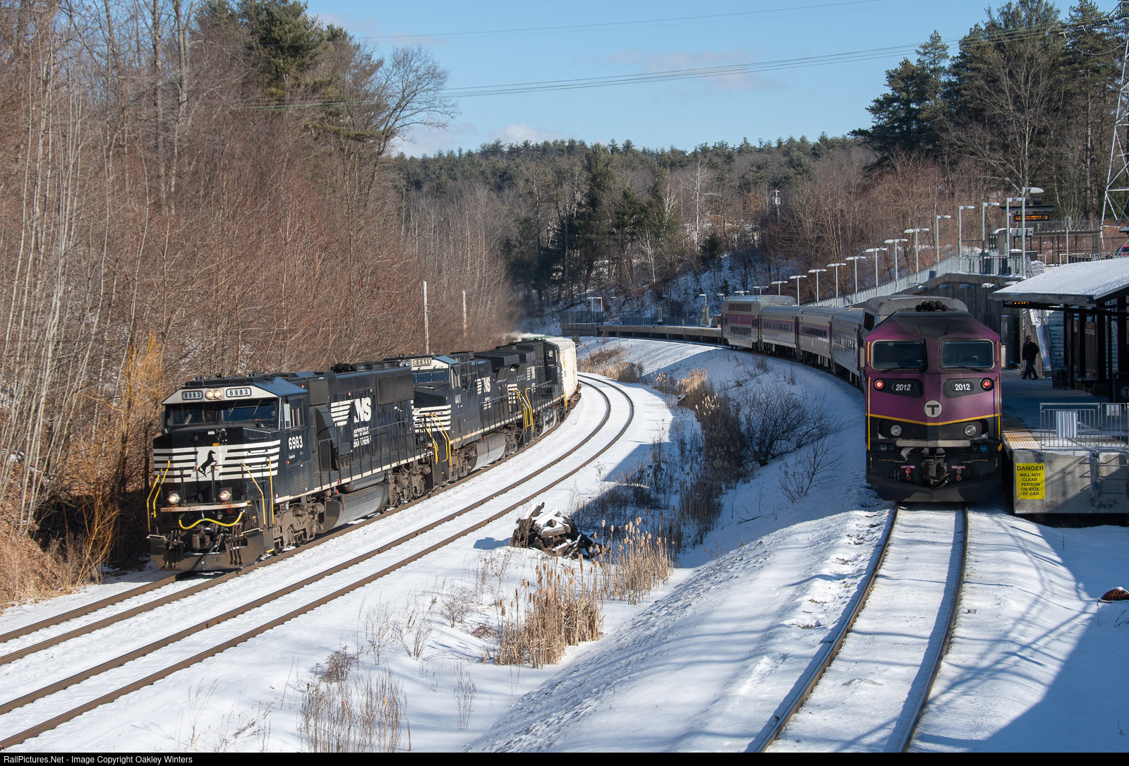 | B&E train B101 (NS 265 to Chicago) accelerates westward through the curves at Wachusett station as an MBTA Fitchburg Line commuter rail train readies for the inbound trip to Boston's North Station. |