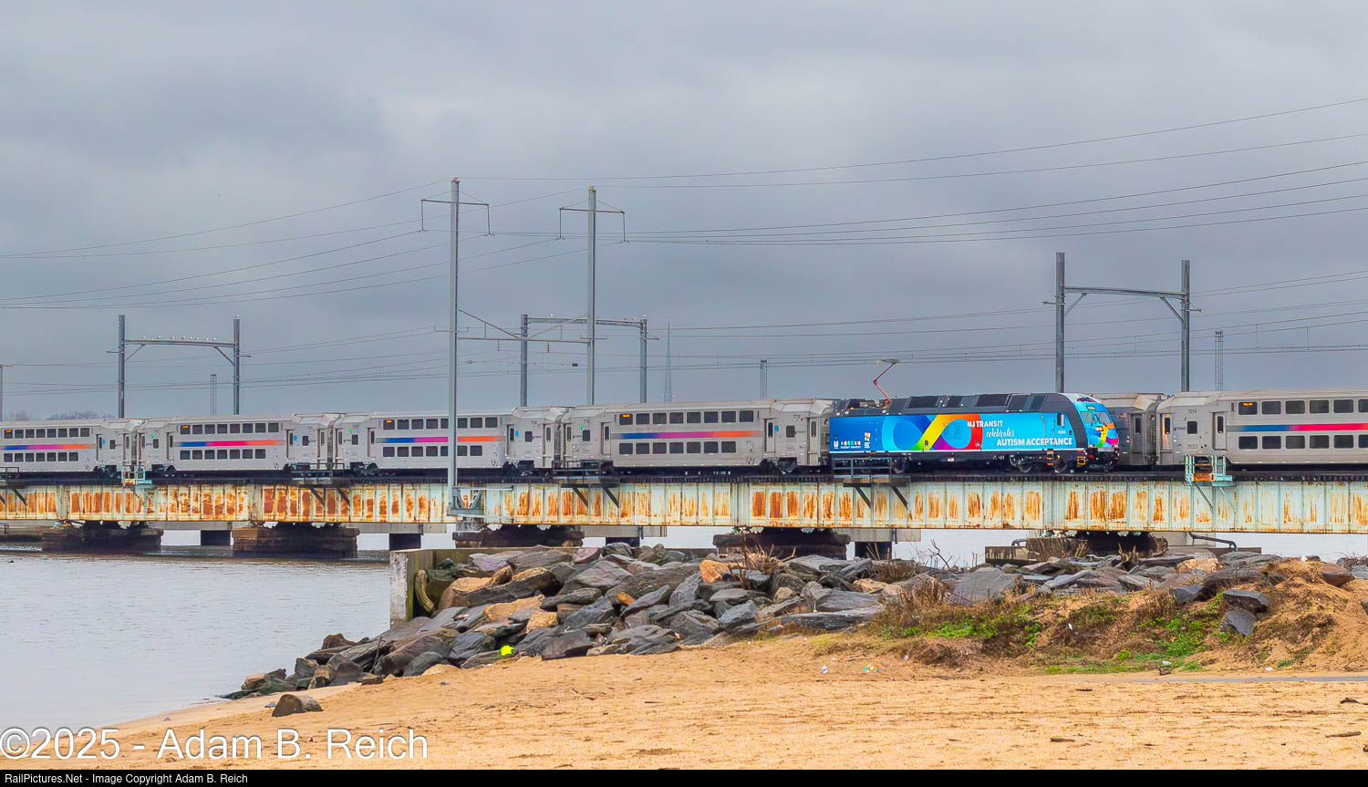 NJ Transit's newest wrapped unit, honoring Autism Acceptance month, crosses the Raritan Bay and into Perth Amboy en route to New York on Monday, April 7, 2025.