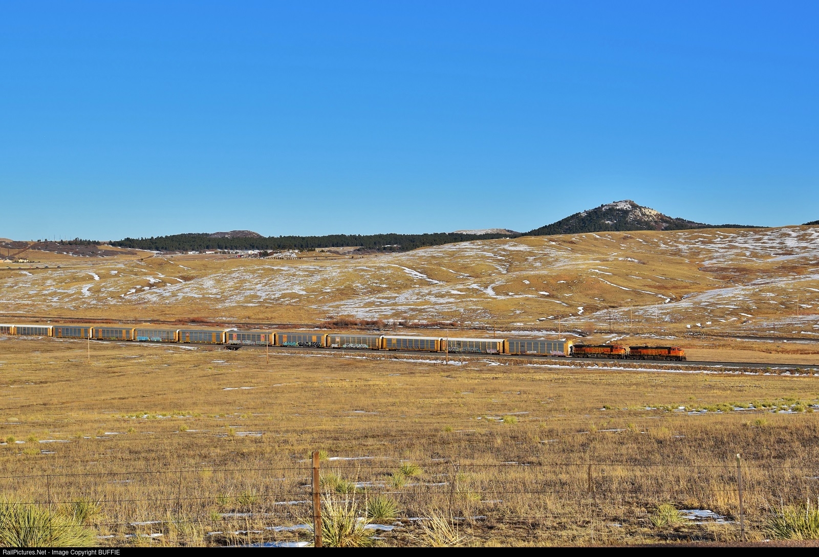 BNSF 5340 (Dash9) leads an autorack train through the open prairie of Greenland, Colorado as it runs south on the Joint Line.
