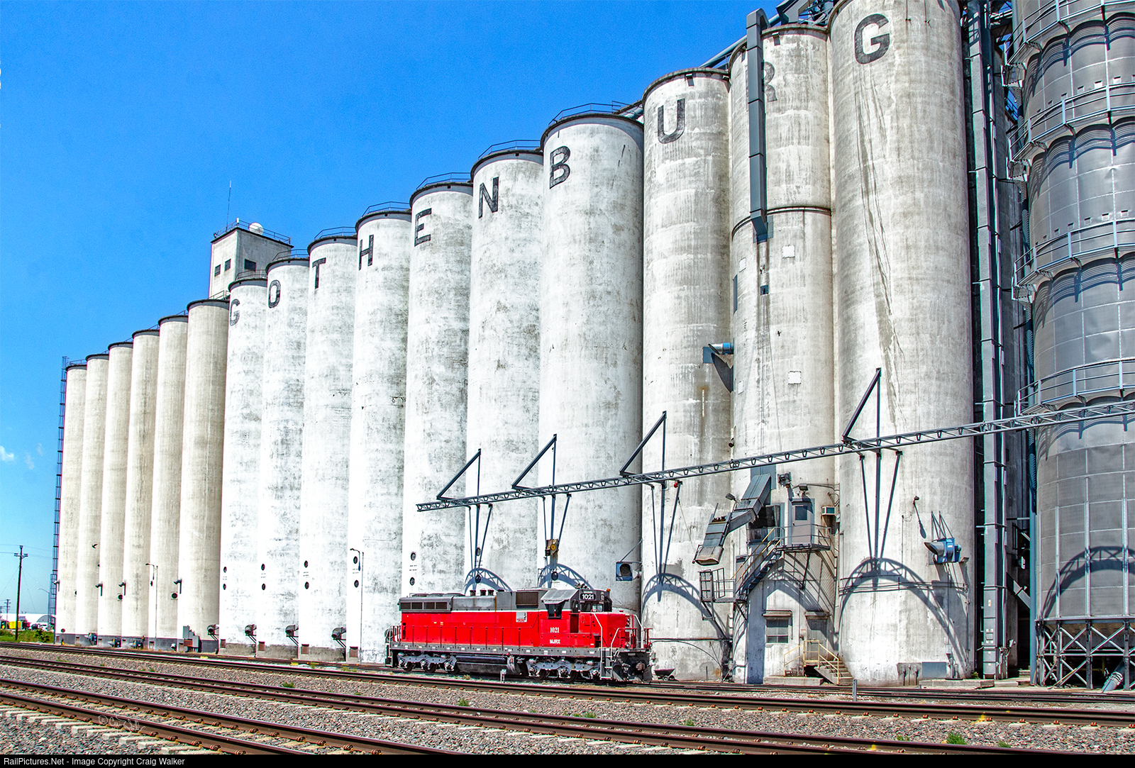 Dwarfed by the massive Farmland Service Co-op grain elevator in Gothenburg is the engine that services it – M. Ryan Railway Service Contractors "SD20" 1021. Built in January 1960 as Southern Railway SD24 6315, this six-axle engine was purchased by Illinois Central and rebuilt into "SD20" 2021. IC eventually sold it off to the Missouri & Northern Arkansas, which subtracted one-thousand from the roadnumber, changing it to 1021. When the MNA deemed it surplus, it was sold to MJRX, which did not renumber the engine. (Gothenburg, Nebraska – August 19, 2017)