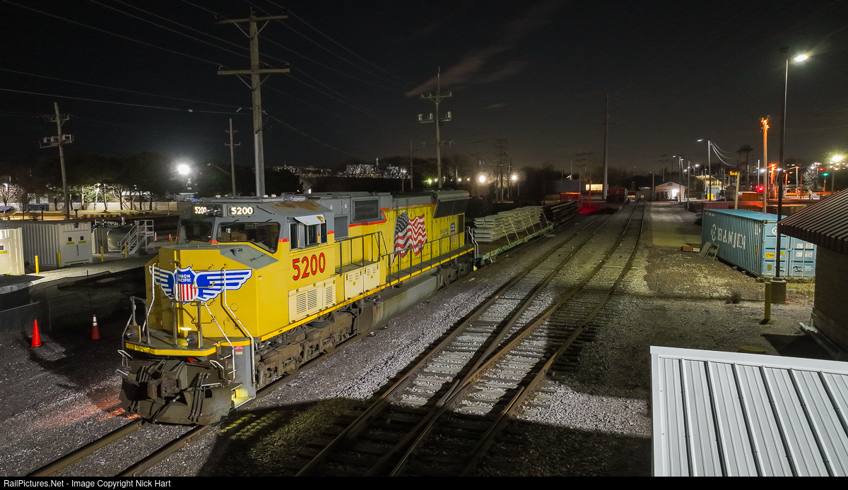 | UP 5200, an SD70M, idles away at the Waukegan Yard as it awaits its next assignment. It was an unseasonably cold night. |