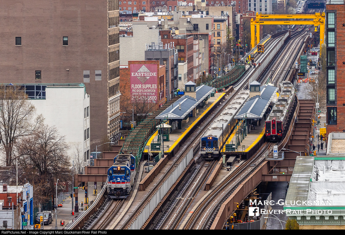 Overview of Rebuilding. The more than 130 year-old Park Avenue Viaduct around the MTA Metro-North Railroad Harlem-125 Street Station in New York, New York, is undergoing a multi-year rebuild to enhance its long-term sustainability. On Sunday, April 6, 2025, the station was bustling with activity as Train 6323 had just departed for Grand Central Terminal while Train 9627 was heading to Southeast, New York. On Track Three, MNCW GP35r work locomotives 103 and 102 are moving a train of continuously welded rail that will drop “sticks” of rail on all four tracks during the day, both for planned work projects and to be held in reserve for emergency use. The Mi-Jack gantry crane in the background has been replacing the structure with pre-fabricated sections for more than a year, and the entire project is planned for completion in 2027.