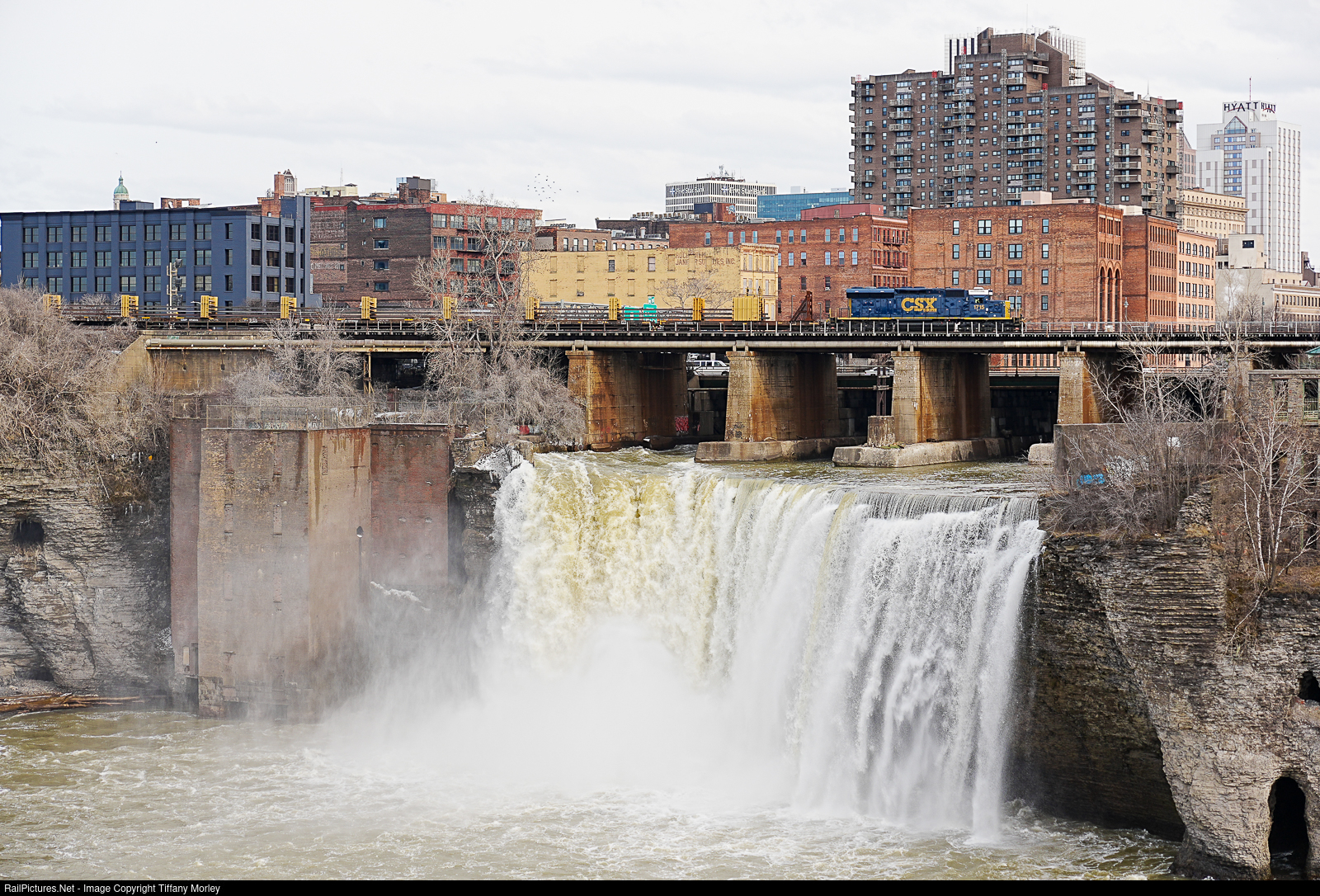 The CSX rail train crosses the High Falls of the Genesee River as they work.