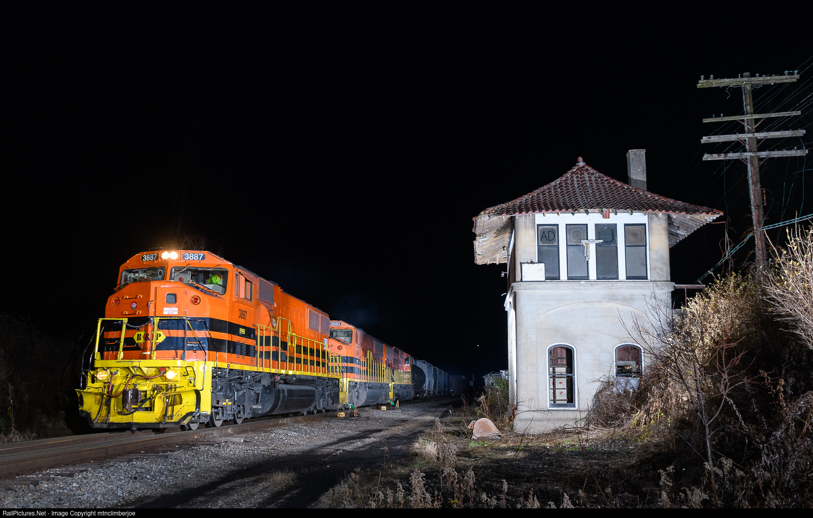 | Led by a trio of SD60's, the Buffalo & Pittsburgh's SIBF breaks the night time silence in Ashford, New York as they make the run north from Salamanca to Buffalo. The train is passing by the shuttered AD Tower, built by the BR&P to control Ashford Junction where the lines from Buffalo and Rochester converged. |