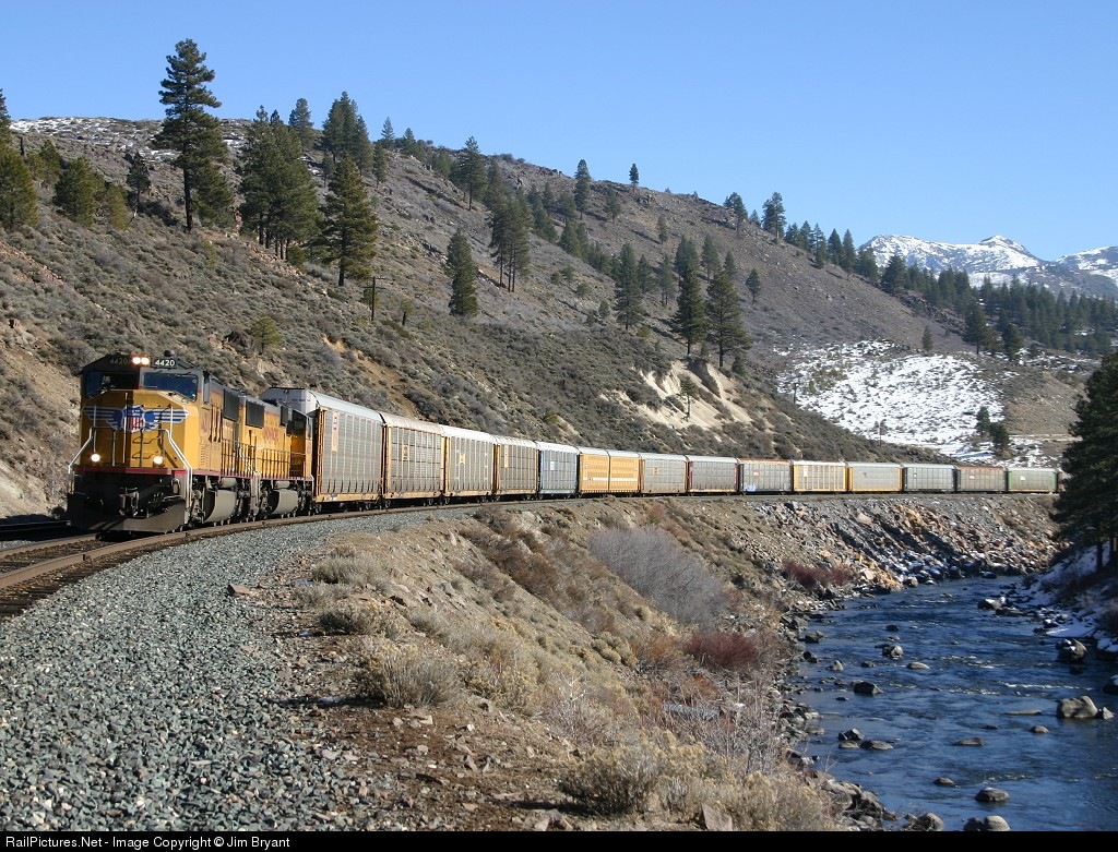 | Because of a slide in the Feather River Canyon, UP's Donner line got real busy. This westman waits for the manned Truckee Helper at Boca. |