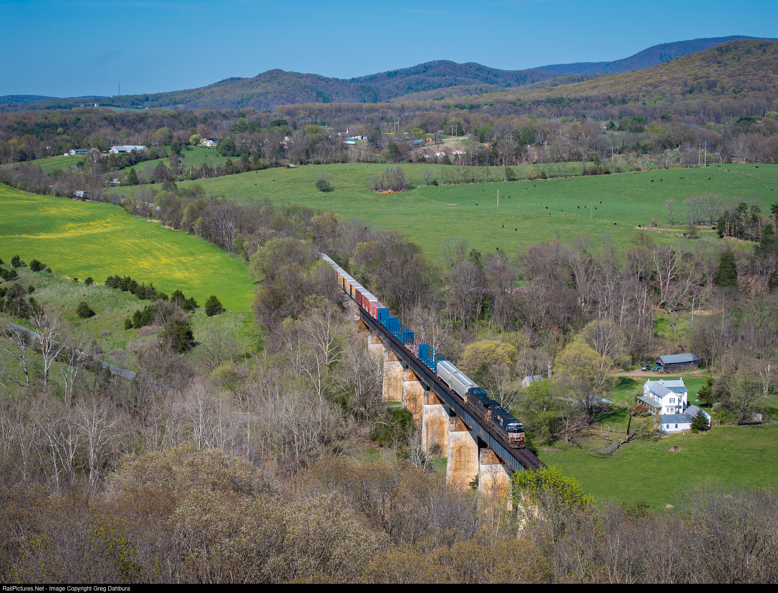 The beauty of spring in the Shenandoah Valley is visible as 15T heads south across the "Jeremy's Run" trestle on its way towards Shenandoah yard.