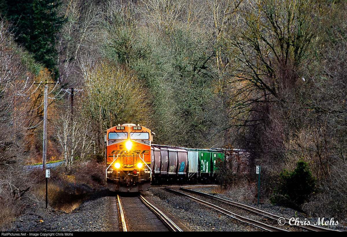 | Westbound BNSF ES44C4 no. 6618 rounds into Washougal WA. Headed Westbound to the Port of Vancouver with a load of grain for shipment overseas.