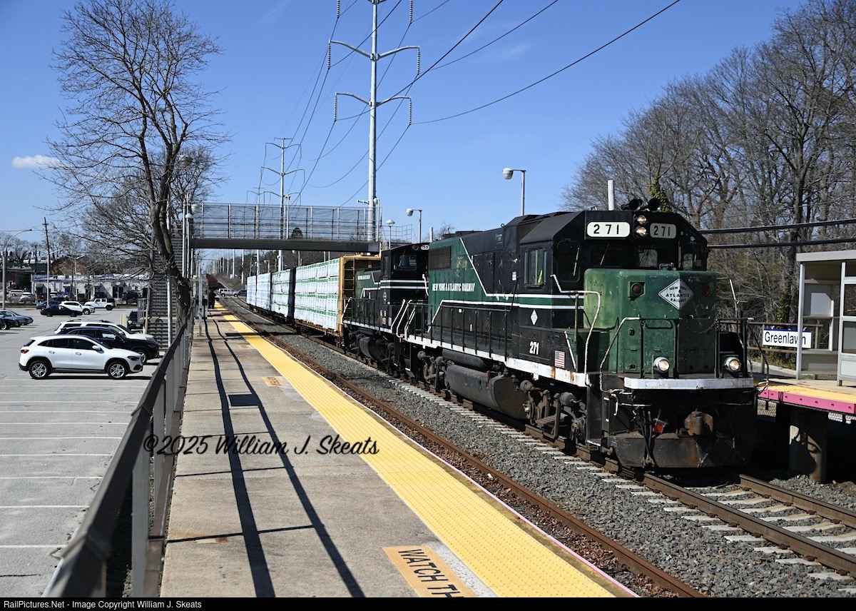| New York & Atlantic RS 40 heading through the LIRR Station in Greenlawn on the Port Jefferson Branch. They will travel to Duke Interlocking in Northport to switch ends. GP38-2 271, MP15AC 155 and four Centerbeams for Kleet Lumber in Huntington. The last active freight customer on the Port Jefferson Branch. |