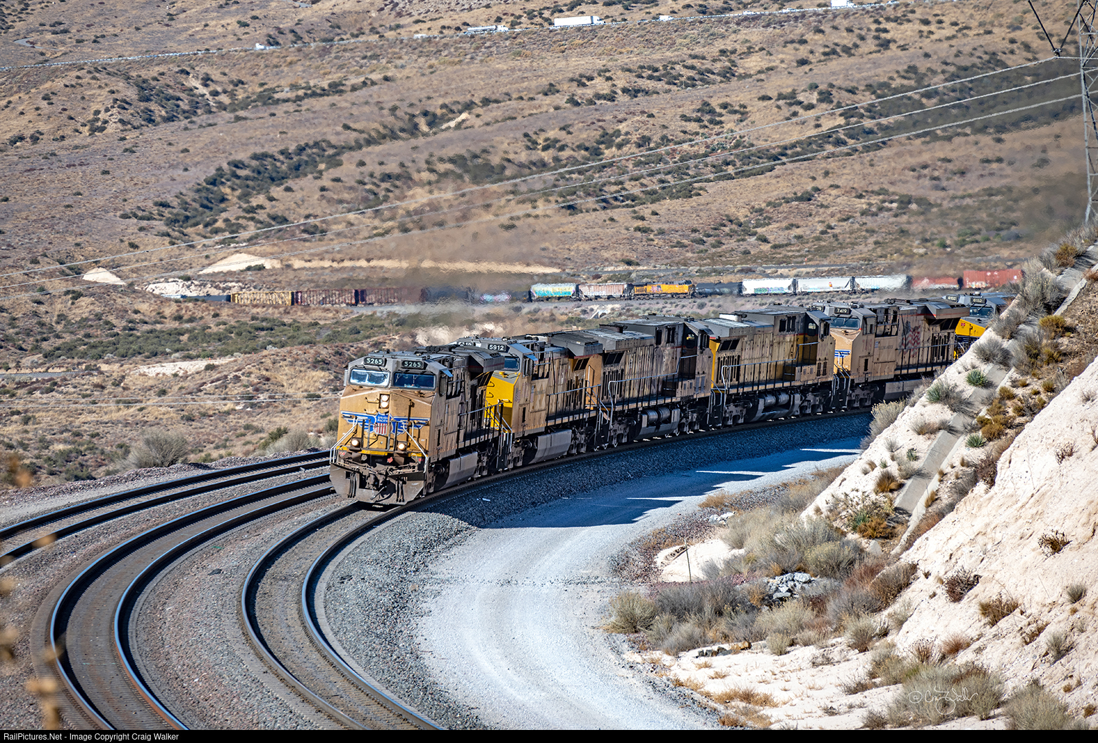 Climbing upgrade and about to crest Cajon Pass' Summit is Union Pacific train MWCNP-02 (but, as it is operating upon BNSF Railway's Cajon Sub, its BNSF symbol is F-MWCNP01-02M). This train departed UP's West Colton Yard about 25 miles back, and crossed over to the BNSF at Keenbrook, in Cajon Pass' lower elevation. This manifest (UP-speak for a loose car freight train) is headed for North platte, Nebraska, and it has a lot of power – a total of 35,200-horsepower – assigned to it. Up front are ES44AC 5265, AC4400CWs 5912, 6077 and 6292, ES44AC 7419, AC4400CW 6152 and ET44AC 2695, with AC4400CW 6403 placed midtrain (and visible in the distance). Not an EMD unit in sight! This train will remain on the BNSF until just nine miles beyond Barstow, where this train diverges back onto UP rails at Daggett. No snow on the Pass in January? Sadly, there was no snow on the Pass all winter. (Cajon Pass, California – January 2, 2025)