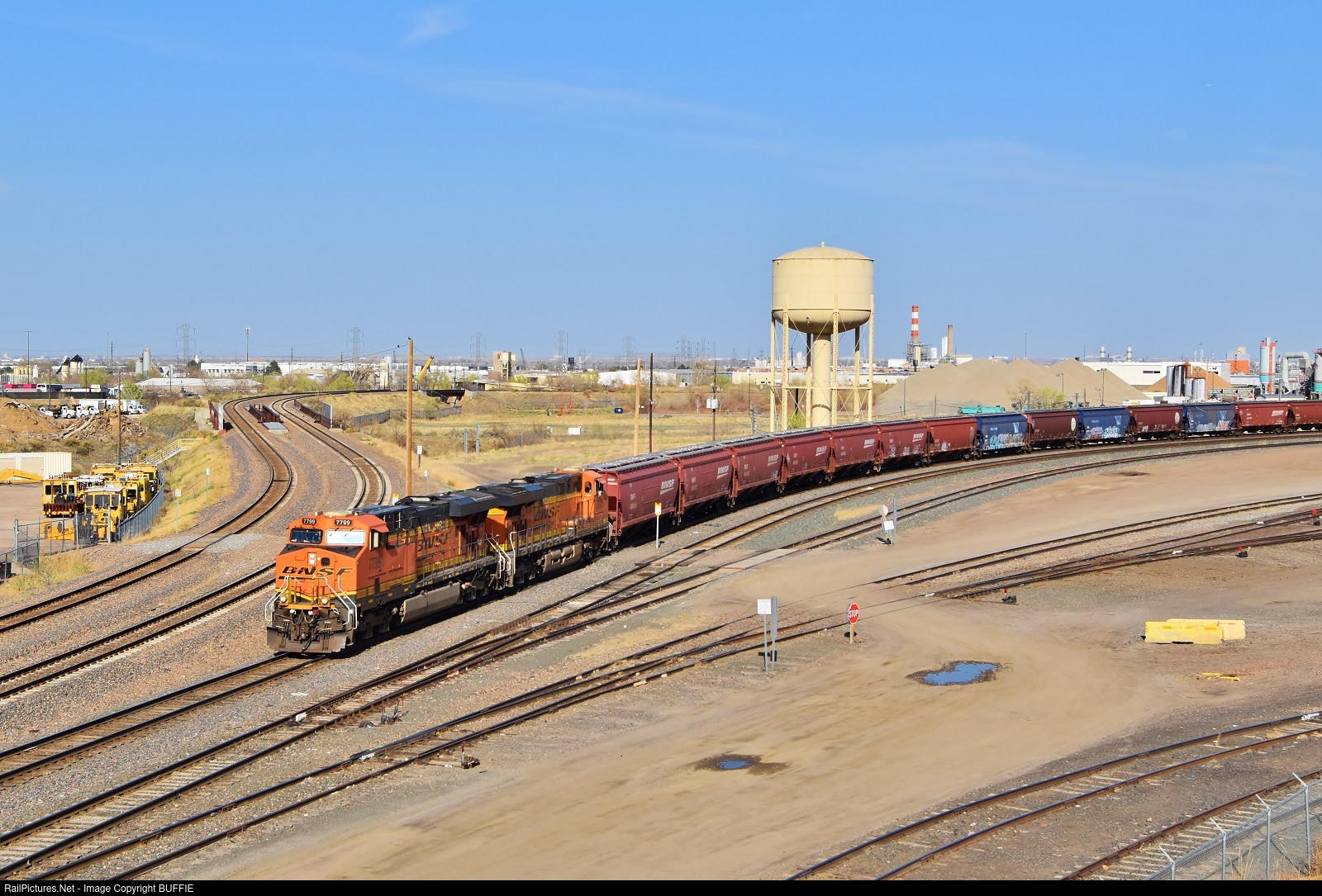 | BNSF 7799 (ES44DC) runs west out of the North Yard in Denver, Colorado, passing the old Colorado & Southern water tower.