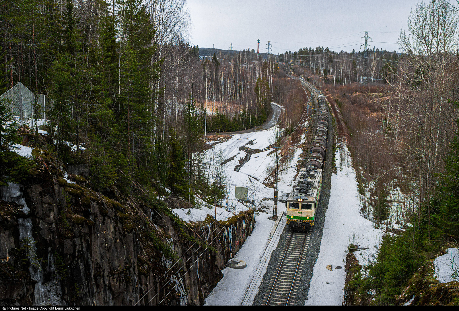 | Snows have been cleared from streets all the way to fields, but corners synonymous with shadows still make cousy conditions for leftover snows for brief time. The cliffs if Pieni Neulamäki tunnel are not an exception, as its corners are still filled with snow that will eventually melt away. A class Sr1 electric locomotive number 3112 is curving with a tanker train from Talvivaara. Soon, it shall dive into the tunnel to demonstrate the darkness that the journey will be before arrival at Harjavalta. |